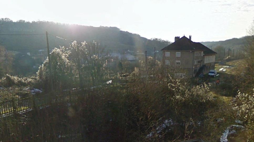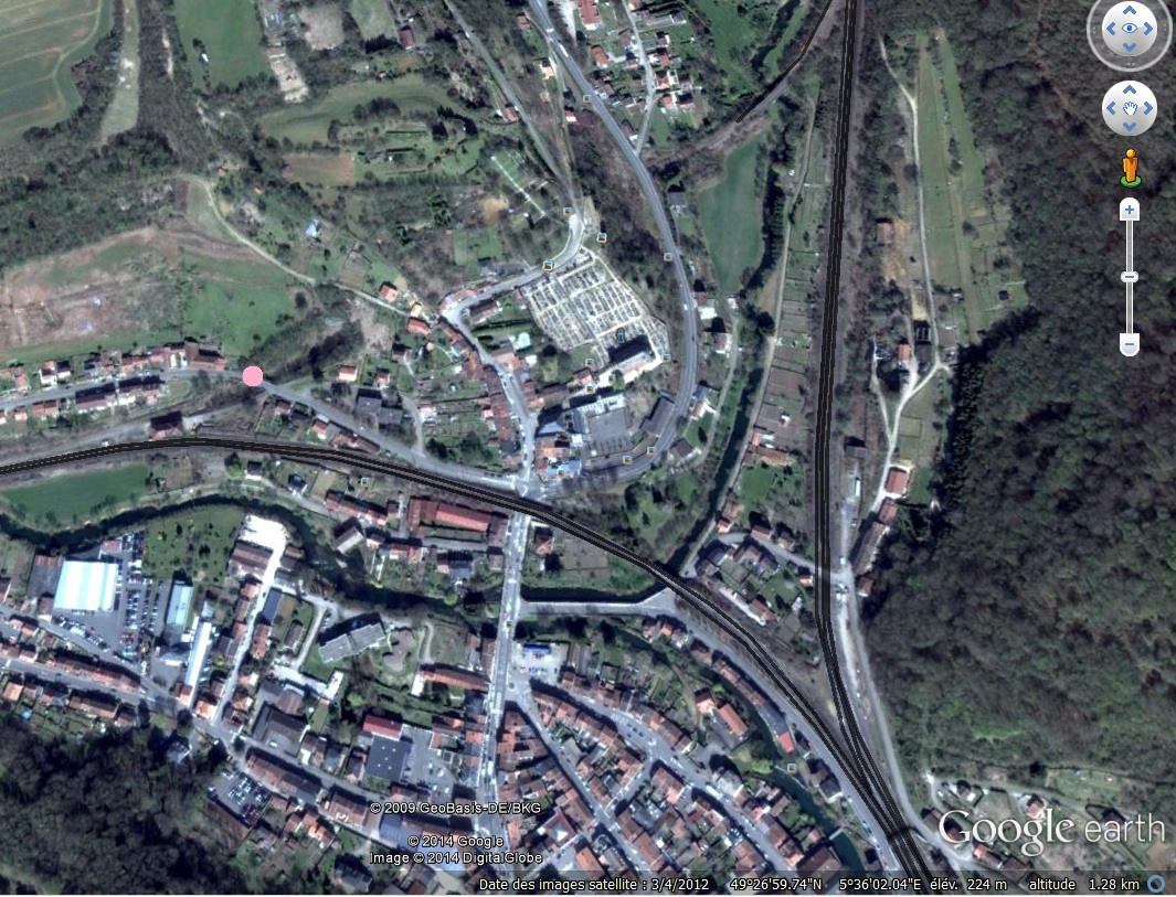 Et ben voilà ! C'est Longuyon ! Personne n'avait vu les supports caténaires en fond de la photo ? Une photo pour indiquer le point exact (en rose), la gare est en bas à droite :