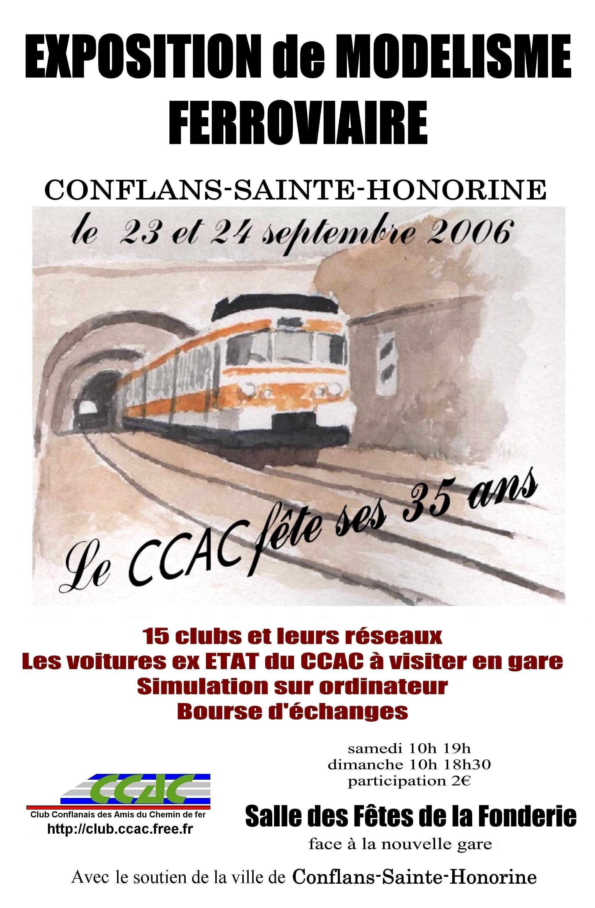 Les 23 et 24 septembre 2006, le CCAC fête ses 35 ans d’existence A cette occasion, le CCAC organise à Conflans-Sainte-Honorine une exposition de modélisme ferroviaire avec le concours d’UNION-RAIL 95. Au programme : · Dans la Salle des fêtes de la Fonderie, place A. Romagné (près de la gare de Conflans-Sainte-Honorine), bourse d’échanges et exposition de plusieurs réseaux en IIm, O et HO du CCAC et d’une dizaine de clubs de la région parisienne. · Dans ses voitures SNCF en gare de Conflans-Sainte-Honorine, présentation en fonctionnement du réseau HO du CCAC. Les heures d’ouverture seront les suivantes : - Le samedi 23 septembre de 10 h 00 à 19 h 00 - Le dimanche 24 septembre de 10 h 00 à 18 h 30 Entrée : 2 € (gratuit pour les enfants de moins de 10 ans) Associations et Clubs participants : - UNION-RAIL 95 - Association Mérysienne de Modélisme Ferroviaire (AMMF) de Méry sur Oise - Association des Amis du Rail du Parisis (AARP) de La Frette sur Seine - Club de Modélisme Ferroviaire de Goussainville (CMFG) - Carrefour 2000 de St Gratien - Train Min’US de Us. - François Sablayrolles (Modéliste indépendant d’Union-Rail 95) - Rail Miniature de la Boucle (RMB) de Gennevilliers - Association Ferroviaire de la Vallée de la Seine (AFVS) de Juziers - Rambolitrain de Rambouillet - Musée des Tramways à Vapeur des Chemins de fer Secondaires français (MTVS) de Butry. - Musée du Train de Rosny Rail de Rosny sous Bois - Einsenbahnfreund Hanau (EFH) d’Hanau (Allemagne) Artisan et commerçant : - CDF - Pierre et Dominique Retenez ces dates dés à présent et à bientôt. mdrmdr