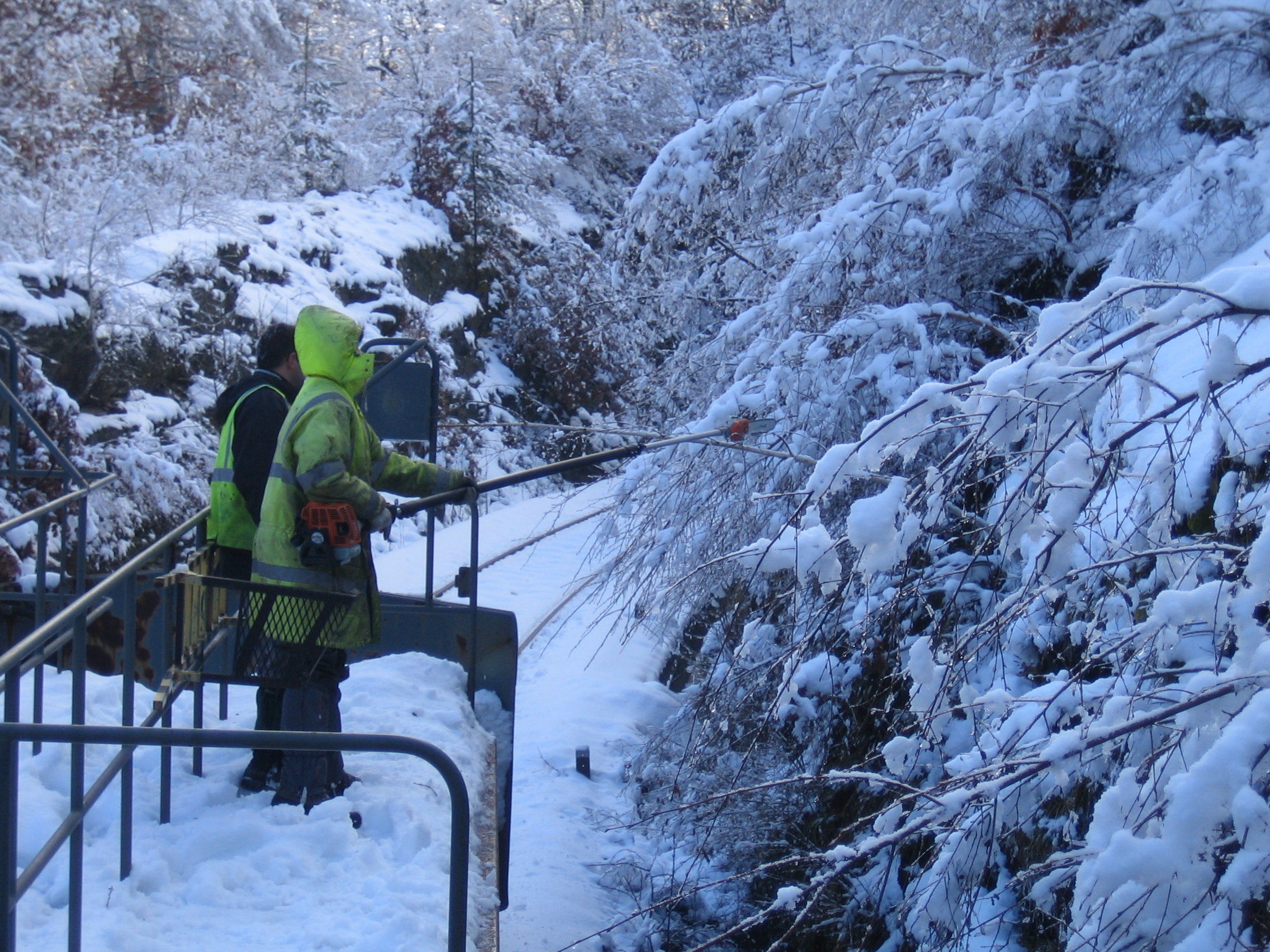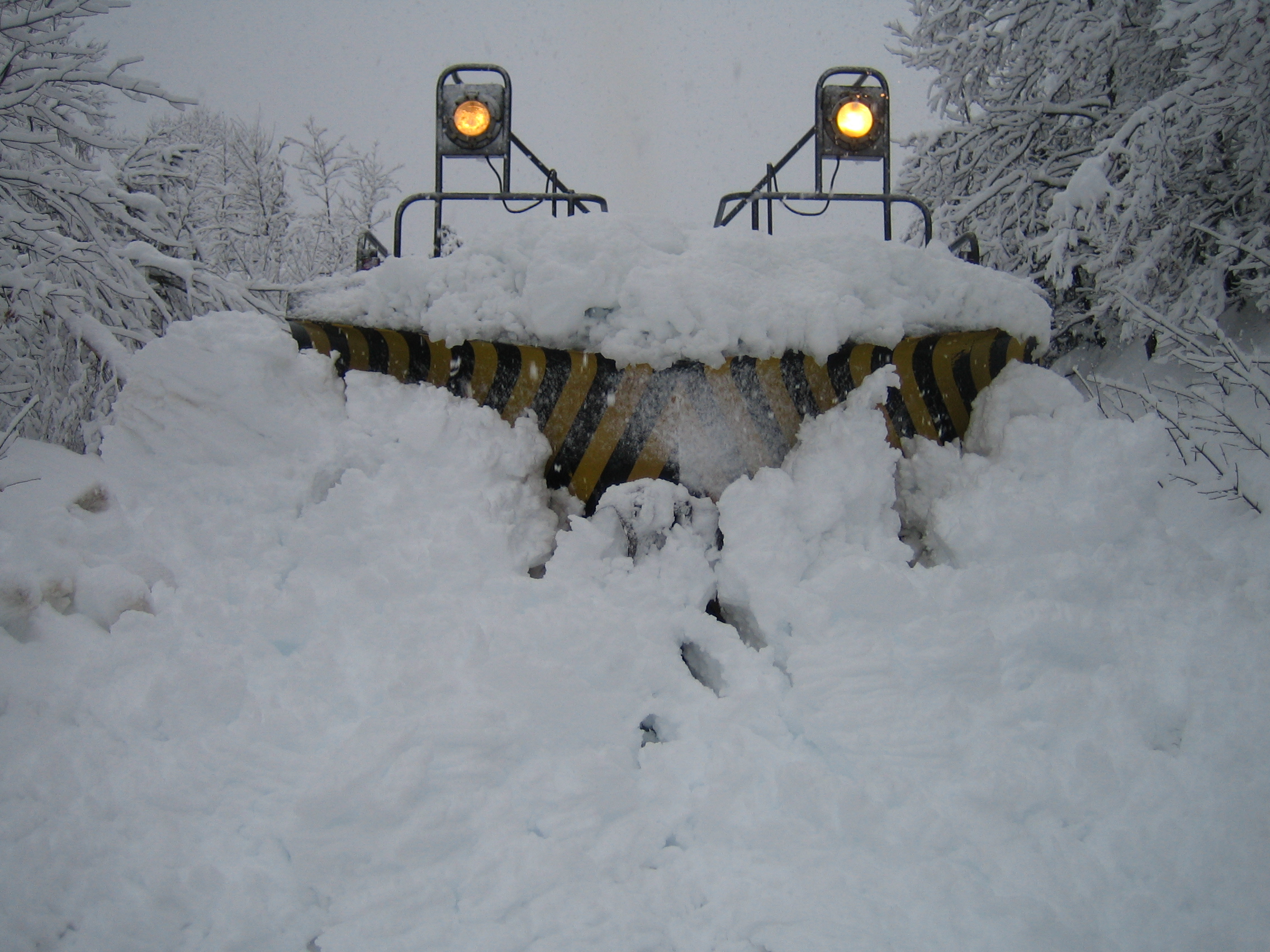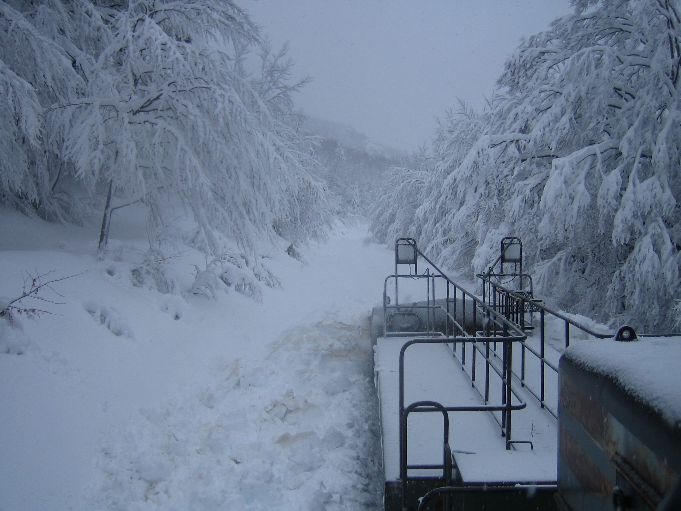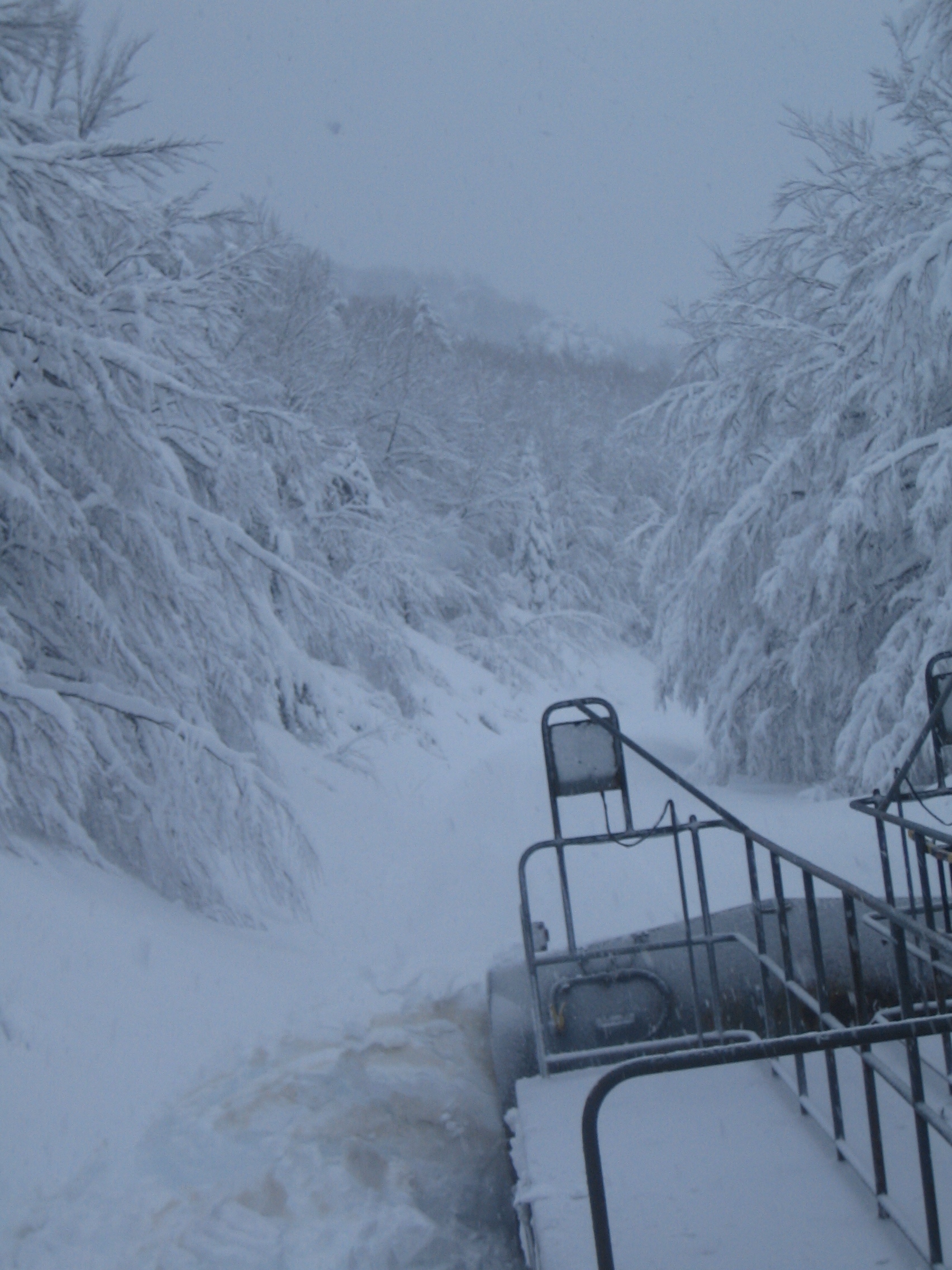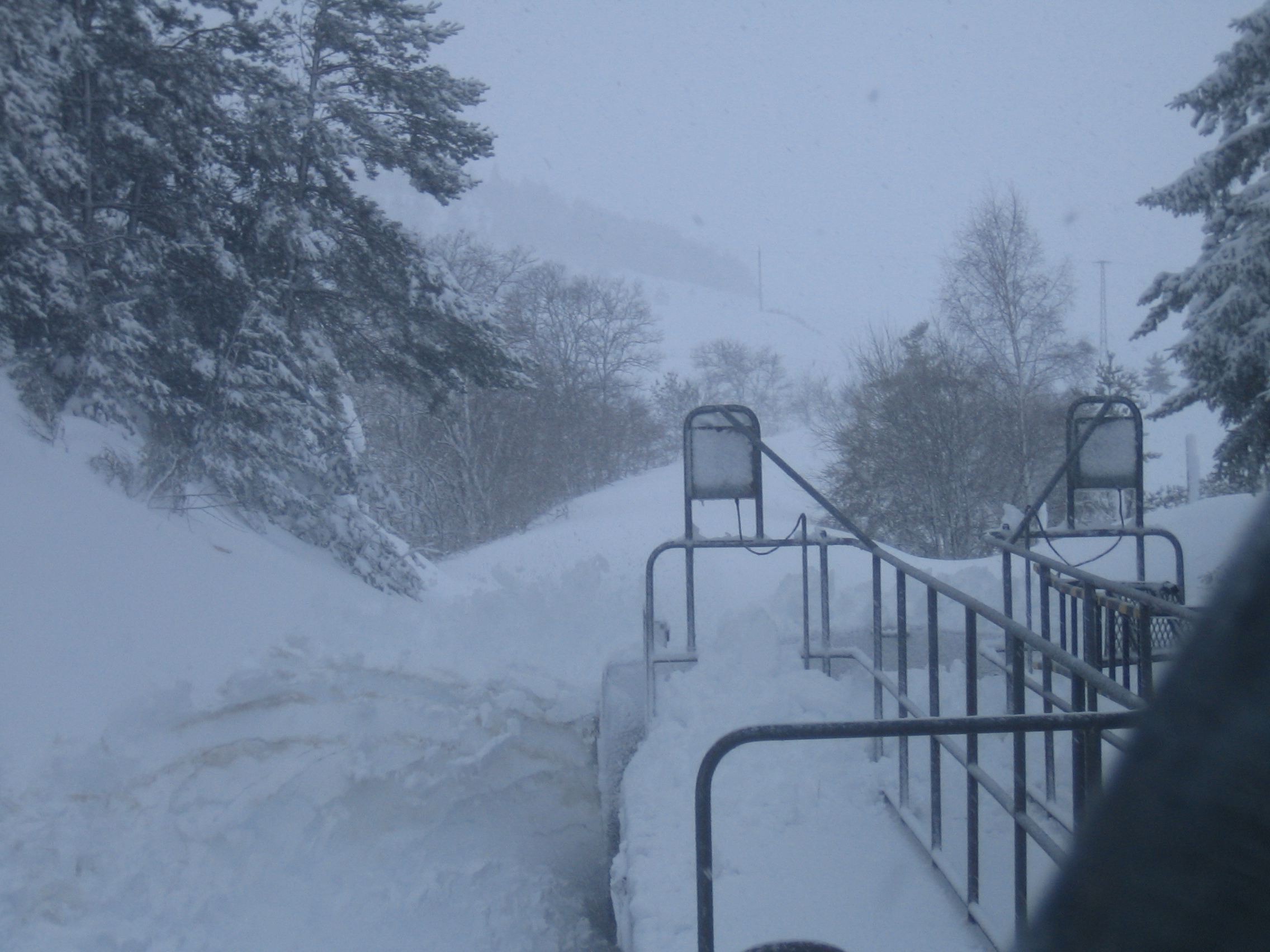 Eh oui, il a fallu arrêter; la neige passait par-dessus le soc, de plus, d'un côté, elle était repoussé mais, du fait de la pente, elle repasse dessous les 66000; cette fois le chasse-neige à étrave n'y a pas suffit.- neige en Lozère