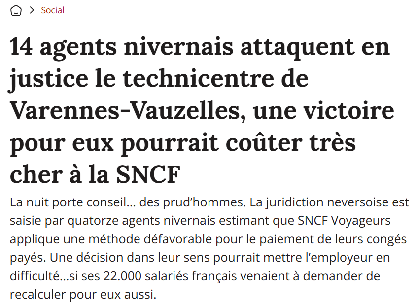 un sujet a été posté par cheminot retraité dans Règlementations SNCF... du travail, de la paie, de la maladie, du contrat de travail, etc."Pour chaque journée de congés payés, vous ne touchez pas votre salaire, mais une indemnité qui est calculée sur la base du dixième de la rémunération brute totale de l’année précédente. Le Code du travail prévoit qu’il est possible de maintenir le salaire, à la place de l’application de cette « règle du dixième », si cela vous rapporte davantage. C’est le cas à la SNCF, par certains acquis sociaux. C’était le cas, selon quatorze permanents de nuit du technicentre de Varennes-Vauzelles. « Quand je prends trois semaines de vacances, je perds jusqu’à 1.000 € d’un coup », explique l’un d’eux. Il met ça sur le compte d’éléments de rémunération qui sautent dans le calcul des congés. Notamment les primes de nuit". (...) (article réservé aux abonnés) Il me semble qu'il y a un problème de syntaxe dans le chapeau de l'article copié/collé ici. J'ai laissé tel quel en italiques. On retiendra le fond de la problématique juridique posée. ________ Le problème juridique, déjà abordé sur ce forum, c'est que le paiement des congés payés à la SNCF ne repose pas sur les dispositions (d'ordre public social pourtant) du Code du travail, mais sur le Statut et un référentiel RH maison. Y compris quand il s'agit de personnel contractuel, ce qui n'est pas le moindre des paradoxes. De fait, en congés payés le cheminot ne perçoit que les éléments fixes de sa rémunération. Exit les primes de ceci et de cela (éléments variables de solde). On parle ici d'indemnités - éléments constitutifs de la rémunération - et non pas d'allocations (réputées être des remboursements forfaitaires de frais qui ne sont donc pas exposés pendant les congés et qui ne sauraient donc être maintenus). Dans les années 1980, environ 200 contentieux ont déjà été portés devant les Conseils de prud'hommes puis ont ensuite cheminé en Cour d'appel et/ou de Cassation. Quelques dossiers ont pris la tangente et se sont retrouvés au Conseil d'Etat en raison d'implications relevant du droit public et administratif. Dispositions règlementaires à la SNCF (où le congé annuel est également dénommé règlementaire et non pas congé payé) réputées prise pour l'organisation et la continuité du service public ferroviaire. La SNCF ayant en la matière historiquement tenu la plume de l'autorité de tutelle sous l'agrément de cette dernière. Des dispositions restées gravées dans le marbre malgré l'évolution des règles sociales, de même que le statut de l'entreprise. Dans la précédente série de contentieux, la Cour de cassation et le Conseil d'Etat avaient finalement jugé que le dispositif des congés étant globalement plus favorable à la SNCF que dans le droit commun, il n'y avait pas matière pour ces Hautes-Juridictions à relever que la rémunération pour ces absences ne soit pas celle du Code du travail (cf. article L.3141-24). L'affaire semble repartie. On va suivre...- Réforme refusée