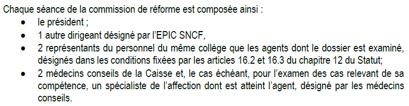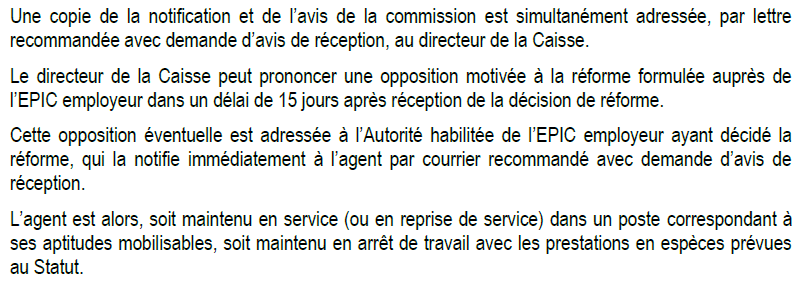 Tiens, un secret du délibéré de la commission de réforme qui fuite ? (RH00359) Peu importe. Le médecin de la CPR présent à la commission de réforme n'est qu'un membre parmi les autres. (RH00359) L'avis de la commission de réforme (car ce n'est qu'un avis auquel se soumet ou pas l'entreprise ; il lui est conseillé de s'y soumettre !) est émis à la majorité. (RH00359) Lorsque la Commission émet un avis d'admission à une pension de réforme, celui-ci est transmis à son tour pour avis conforme (c'est à dire identique) à la CPRPF. (RH00359) A noter, c'est le Directeur de la caisse qui se prononce et non pas un quelconque médecin-conseil même si on se doute bien qu'ils s'en entretiennent. (lire dorénavant à la place du Tribunal de grande instance : pôle Social du Tribunal judiciaire, l'ancien tribunal des affaires de sécurité sociale)- Inaptitude à venir - Quid missions à réaliser