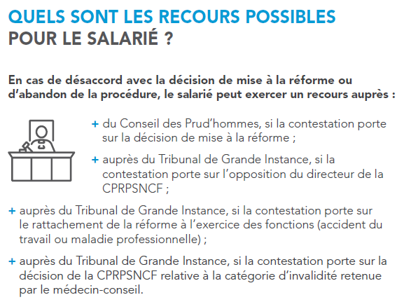 Vu de l'extérieur (du dossier) et en termes de généralités, cela signifie que le médecin conseil estime que votre état de santé vous permet toujours de tenir un emploi au sein d’une des sociétés SNCF. Il y a des centaines d'emplois différents à la SNCF, dans différents métiers, différentes filières, avec plusieurs régimes de travail au cas par cas. En cas d'inaptitude sur un poste, la règle est bien de mener à bonne fin un reclassement quoiqu'il en coûte. Ça aurait pu être aussi la Commission de réforme qui aurait tiqué sur l'insuffisance de recherche d'un reclassement. Le directeur de la CPRPSNCF disposait de 15 jours, à réception de la notification de la décision de la Commission de réforme, pour former une opposition motivée à la mise à la réforme et informer l’entreprise de sa décision. Dans la situation présente, l'entreprise n'a pas le choix que d'abandonner la procédure de réforme qui était en cours. Le mot important c'est : " (opposition) motivée". De cette motivation, la SNCF en tant qu'employeur va devoir tirer les enseignements utiles. Il n'est pas dit que si l'inaptitude perdure et que les reclassements restent impossibles ou en échec qu'une nouvelle procédure de réforme ne soit de nouveau engagée. La décision de la CPRPF se conteste (par le salarié) le cas échéant. Je ne saurais dire si c'est une décision administrative ou médicale (sans doute un peu des deux) ni donc déterminer si le recours s'exerce devant la CRA - commission de recours admnistratif - ou devant la CSMM - commission statuant en matière médicale. Voir auprès de la CPRPF. Ou sinon de l'établissement qui sera sans doute également intéressé à ce que ce recours soit exercé. Il est toujours plus simple pour un établissement de réformer que de reclasser.- Maintien de solde