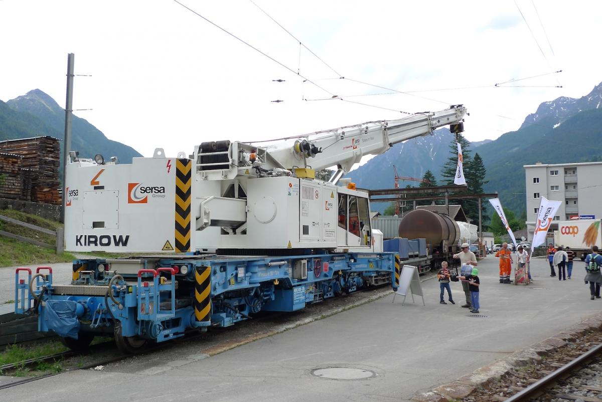 Une grue Kirow sur la ligne à voie métrique de la Bernina en Suisse. Photo prise lors d'un voyage organisé en 2010 par le COPEF pour le centenaire de la ligne.
