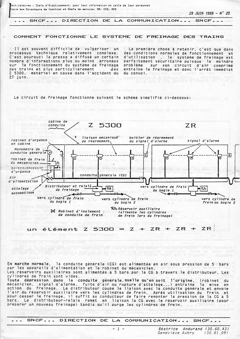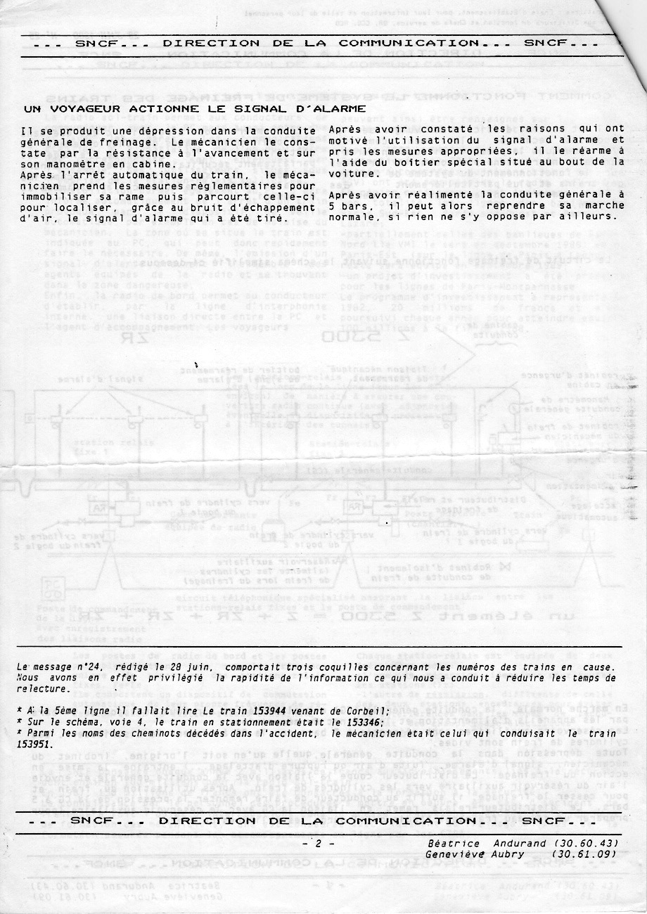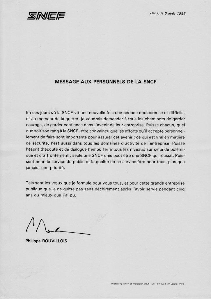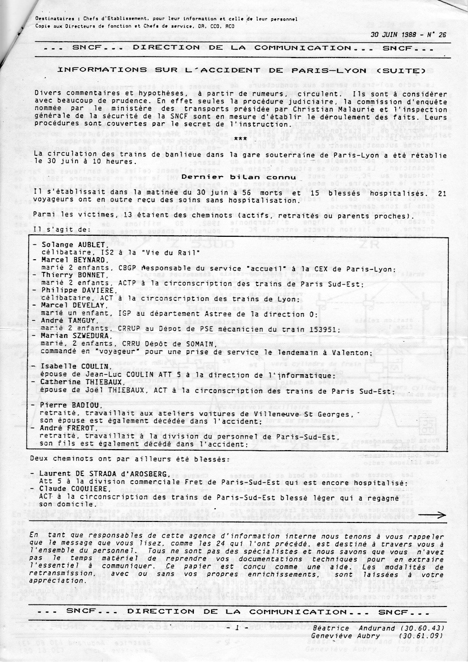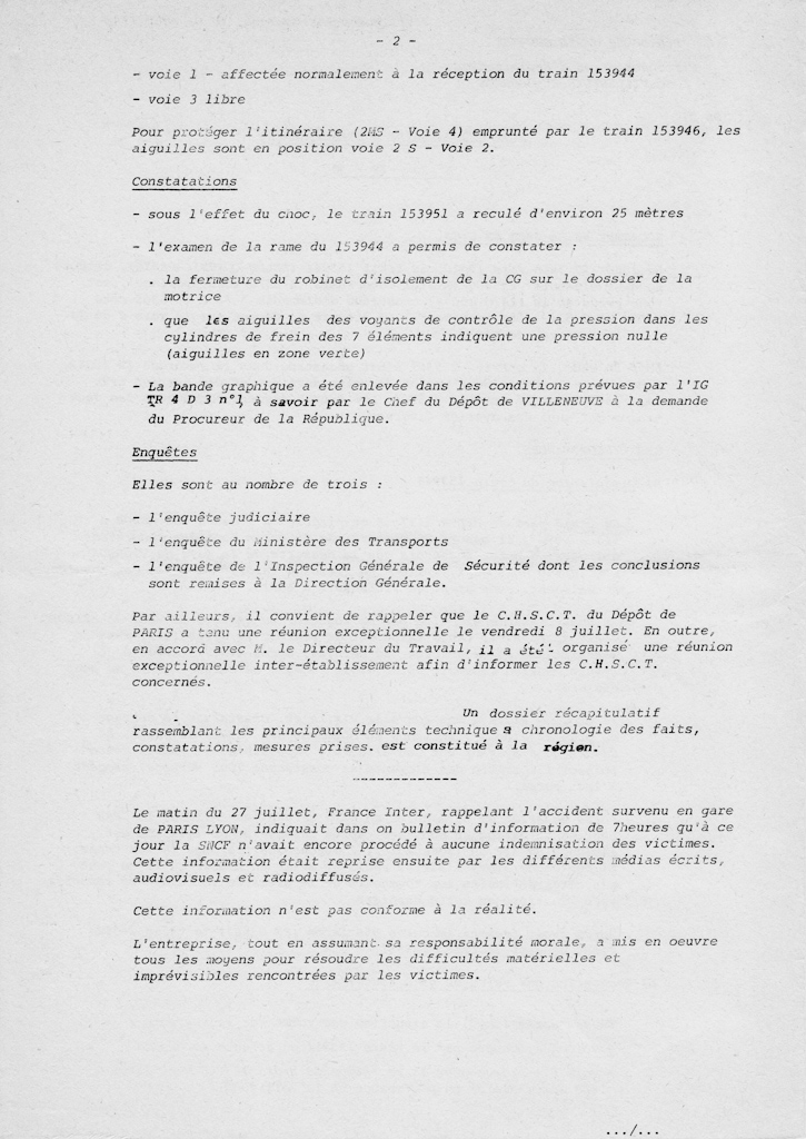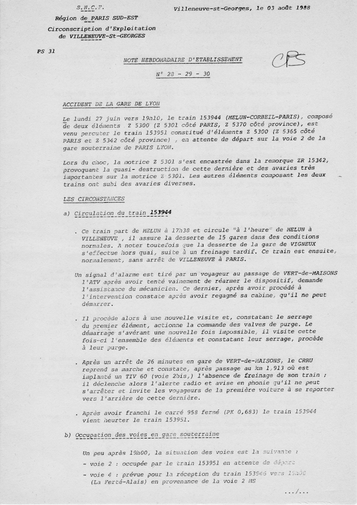J’ai été rechercher dans ma cave des documents que j’avais gardés sur l’accident de la gare de Lyon. J’espère que ça ne va pas choquer, car ça prend aux tripes. Sur la photo de Paris Match, on voit que la Z5301 tamponneuse a ouvert comme une boite de sardines la ZR5342 tamponnée. La Z5301 a littéralement roulé sur la ZR5342. Je ne dis pas ce qu’il y a en dessous de la Z5301 ; c’est là où il y a eu presque toutes les victimes Les spécialistes ont eu du mal a expliquer ce chevauchement. les notes et message du directeur au personnel Le président de la SNCF Rouvillois est limogé à la suite de cet accident et celui de la gare de l'Est, par le ministre des transports socialiste Delebarre.