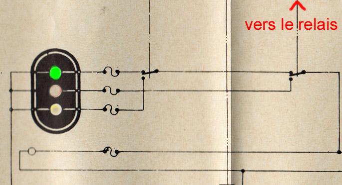 21. Schéma simplifié du cours de signalisation de chef de district (de mon père, années 70). Sauf erreur, il n'y jamais manque d'énergie pour la signalisation, car il y a des batteries de secours en cas panne d'alimentation. En général, l'extinction du feu d'un signal vient d'un fusible ou de l'ampoule qui claque.