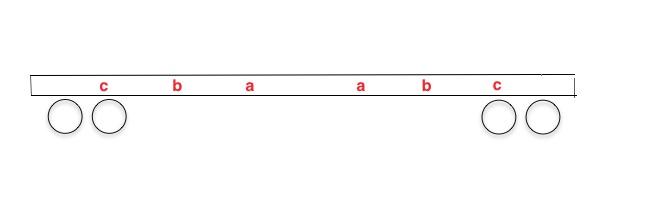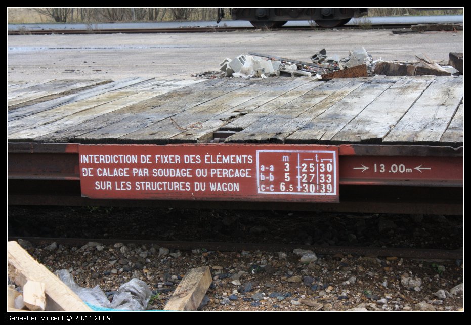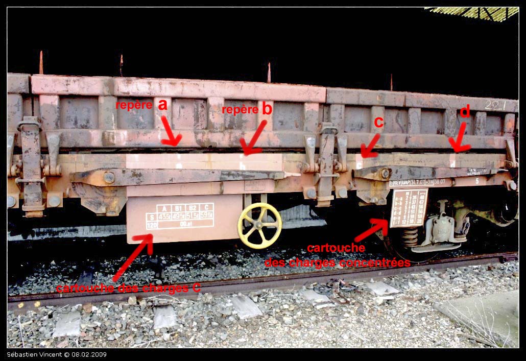 9. Sur l'importance de la charge par mètre linéaire, on retrouve cela dans les prescriptions de chargement UIC des wagons. Sur cette photo du site http://www.photos-ferroviaires.fr, le wagon plat U13 surbaissé (j’ai pas trouvé mieux) prend normalement 39 tonnes en charge C sur toute la longueur du plancher. Mais, on voit que sur le cartouche des limites des charges concentrées, entre les lettres a et a qui sont peintes sur le châssis du wagon, la charge est réduite à 25 t sur 3 mètres linéaires ou 30 tonnes sur lambourdes, etc. Pour préparer les examens, on nous présentait le cas d’un chargement de x tonnes et d’une longueur comprise entre les lettres a-a et b-b. Il fallait donc faire une règle de trois pour vérifier la conformité. Pour ceux qui comme moi n’ont jamais réussi à bien « poser » une règle de trois, ce n’était pas la joie. ​Le marquage a, b, c sur le châssis du wagon (j'ai pas trouvé de photos valables sur le web)