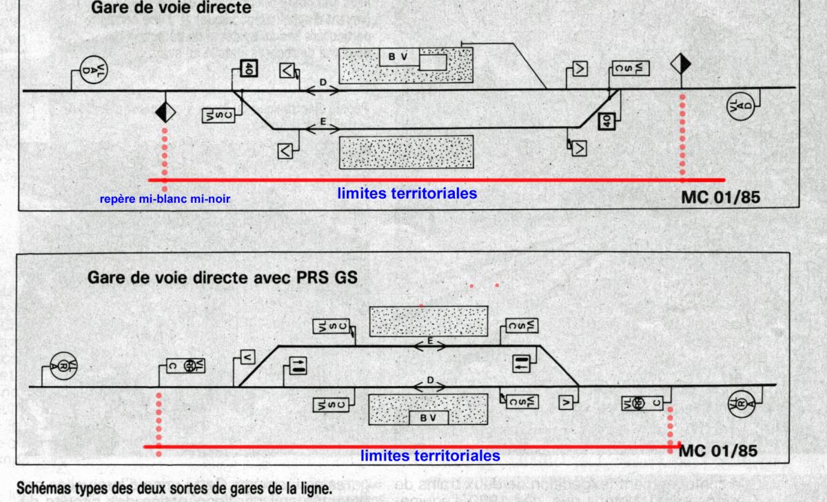 16. Dans le Règlement général de sécurité (RGS) de la SNCF, il est dit que les limites territoriales d’une gare sont fixées conventionnellement en voie unique, de chaque côté par le signal d’entrée, s’il en existe un, sinon par un repère spécial mi-blanc, mi-noir. Les parties de voies situées en dehors des limites définies ci-dessus sont dites « en pleine voie ». À la SNCF, il n’y a pas de poteau PLP, mais je pense que l’équivalent serait le repère spécial mi-blanc, mi-noir, qui repère la limite de certains établissements ou la pancarte LM (limite de manœuvre). Du point de vue de la sécurité, si un train se trouve arrêté accidentellement dans les limites de la gare, il doit être pris en charge par l’agent circulation : demande de secours « en gare », aide à la visite du train, etc. Ce qu’on m’a appris : il suffit qu’un seul wagon du train soit dans les limites pour que le train soit considéré en gare. — Je ne vois pas à quoi correspondent les limites géographiques de la gare vis-à-vis des gares encadrantes. Pour ce qui est des limites d’intervention de l’opérateur sur les installations de sécurité, à la SNCF, cela relève d’une consigne importante, dite consigne rose, il n’y a pas de limites géographiques d’intervention de l’opérateur sur ses installations de sécurité. Il y a la consigne rose et le schéma de signalisation. ci-joint, schémas de VU avec limites territoriales selon le règlement SO.
