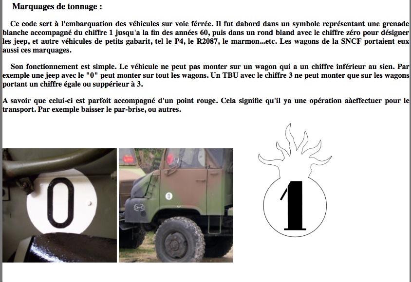 8. Ce qui est intéressant à retenir, c’est que lorsqu’on dit qu’un wagon prend 59,5 tonnes en charge C, c’est 59,5 tonnes sur la longueur du plancher. Un char Leclerc a une longueur de 6,88 pour 57 tonnes ne peut pas être chargé sur n’importe quel wagon plat. Sur la photo au-dessus, le wagon est un plat R qui peut prendre 59,5 tonnes, mais entre les repères d-d, il est autorisé 51 tonnes sur 7 mètres. Là, ça ne vaut pas le coup de faire la règle de trois, parce que de toutes façon, ce n’est pas bon. Le char Leclerc ne peut pas être chargé sur ce wagon. Normalement, pour les véhicules militaires, il y a un marquage spécial sur le wagon. C’était une grenade blanche, maintenant un rond blanc avec un chiffre noir que l’on retrouvait sur le véhicule militaire correspondant.