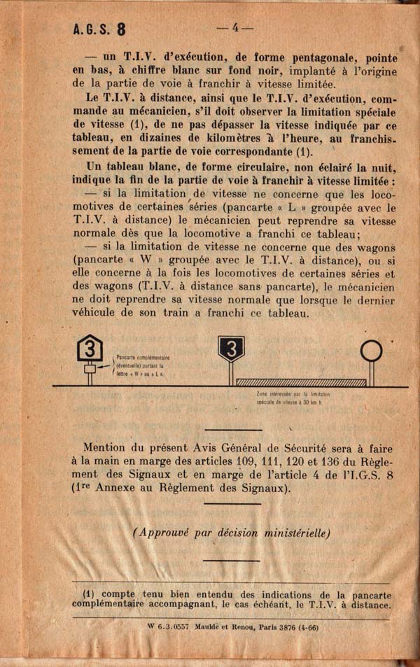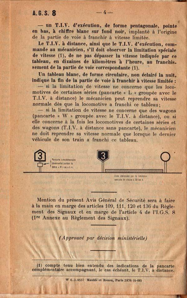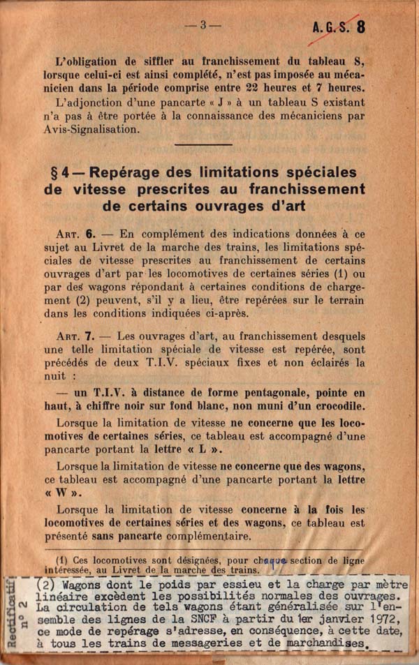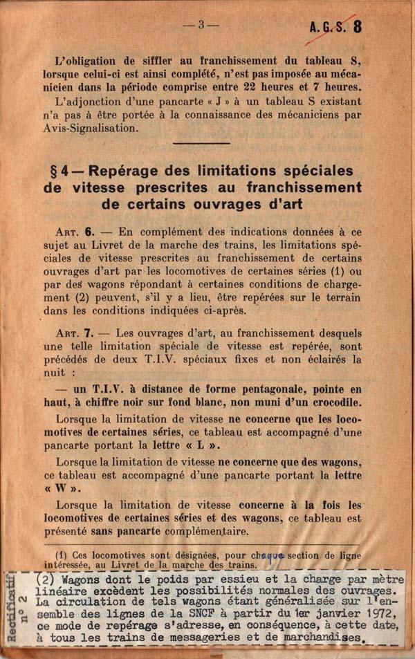 10. Je garde pieusement mon Titre I signaux, que j’aimais bien. Il est encarté la fin du règlement un Avis général sécurité (AGS 8) de 1966 qui traite du feu rouge clignotant, de la bande jaune horizontale, de la pancarte J et du TIV pentagonal. Je trouve que c’est mieux expliqué que le RGS « rouge » : cela concerne les locomotives désignées pour chaque section de ligne, désignées au LMTr, et les wagons dont le poids par essieu et la charge par mètre linéaire excèdent les possibilités normales des ouvrages d’art. Je ne me souviens plus si c’est le passage à 22,5 t par essieu (la charge C des wagons). La lettre W n'existe plus, le tableau rond est remplacé par un pentagonal.