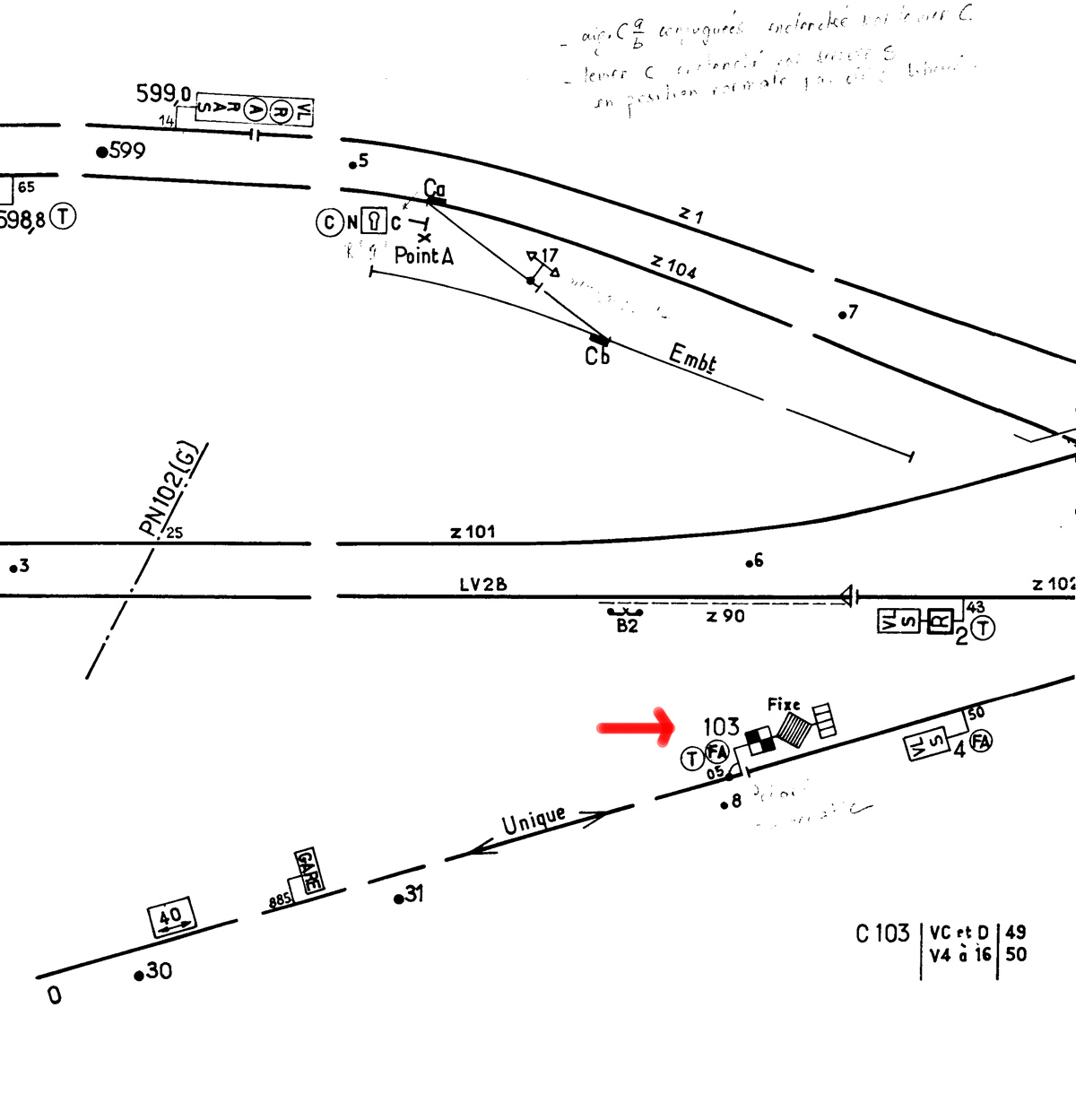 17. Dans le cas de figure de ce schéma type de signalisation, le bulletin peut servir aussi bien pour le carré mécanique 103 qui porte un avertissement que pour les panneaux lumineux du poste de gare.