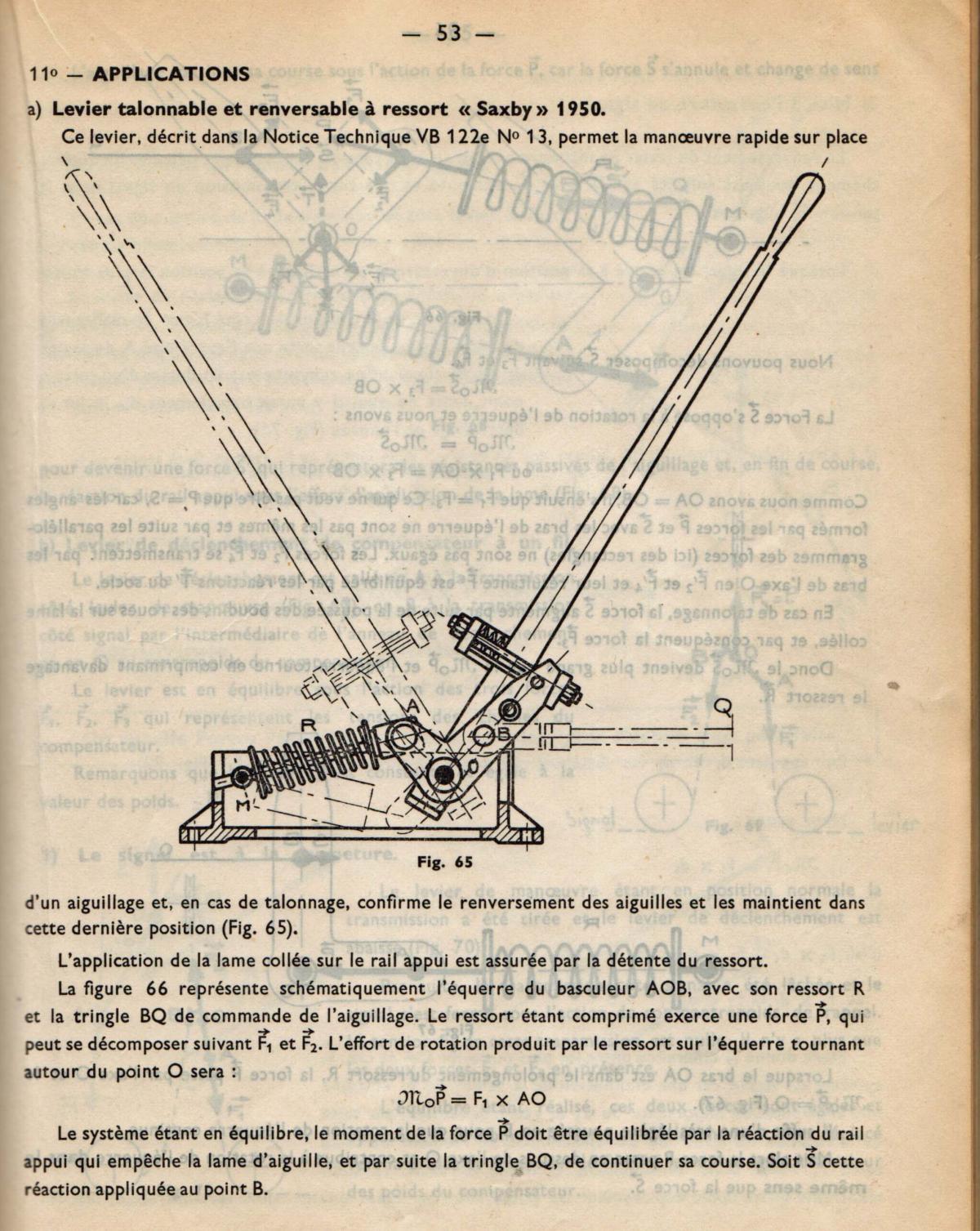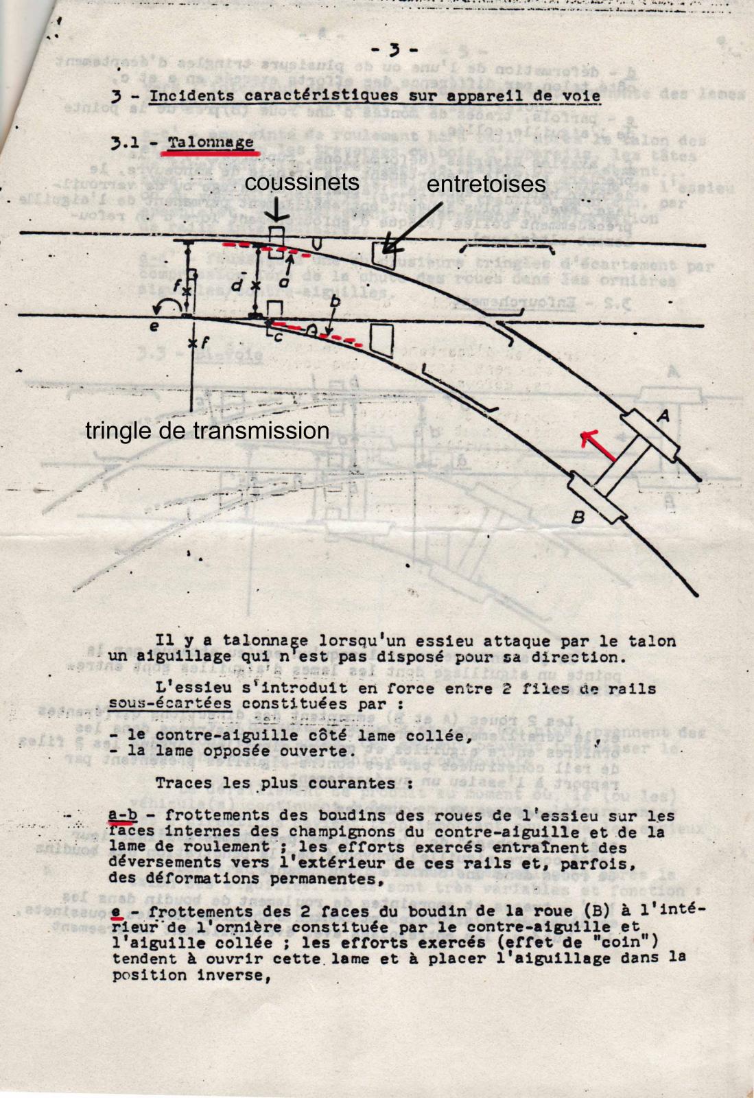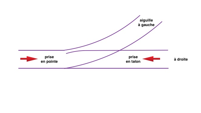 Pour le vocabulaire : on dit « prendre une aiguille en pointe » ou « prendre l’aiguille en talon ». On dit « aiguille à droite » ou « aiguille à gauche » pour indiquer sa direction (l’aiguilleur dira « normal » ou « renversé » pour son levier de commande). Pour prendre l’aiguille en pointe, il faut que les lames d’aiguilles soient disposées à droite ou à gauche et qu’elles soient « calées » par un dispositif (il y en a de toutes sortes) pour éviter qu’elles se décollent au passage d’un mouvement. Le calage le plus simple (sur voie de service) est l’aiguille dite à lentille (levier L). C’est un contrepoids qui assure le collage et le calage de la lame ; c’est une aiguille piégeuse pour les manœuvres en cas de talonnage, si la goupille est en place ou non, ça se passe différemment. Les aiguilles manœuvrées par un moteur ont un calage couplé au moteur. Théoriquement avec ce de genre de calage, l’aiguille n’est pas talonnable, sauf dans certaines dans certains secteurs, comme les faisceaux de débranchement où toutes les aiguilles à moteur sont talonnables non renversables. Les aiguilles commandées depuis un poste d’aiguillage sont non renversables, car il faut qu’il y ait concordance entre la position du levier de commande et la position sur le terrain pour que l’aiguilleur s’y retrouve, sinon il y a une sonnerie de discordance qui se met en route en continu. Les aiguilles commandées à pied d’œuvre peuvent être talonnables renversables. Ce qui permet le talonnage est un dispositif avec un ressort : voir le levier à pied d’œuvre Saxby qui est un levier talonnable renversable. Sur voie principale, les aiguilles sont normalement non talonnables, car en plus du calage, il y a un dispositif de verrouillage : le VCC, qui verrouille la lame collée et la lame décollée. Sauf sur certaines voies uniques où l’aiguille de sortie de gare est talonnable non renversable (surtout pas), mais à condition que l’agent circulation l’ait déverrouillée. Le calage d’une aiguille prise en pointe sur voie principale est assuré à 100 %. Il y a 5 positions contrôlées : collage lame, décollage lame opposée, calage, verrouillage et concordance. Si l’une de ces conditions n’est pas assurée, l’enclenchement dit « contrôle impératif » maintient à la fermeture le signal de protection de l’aiguille.