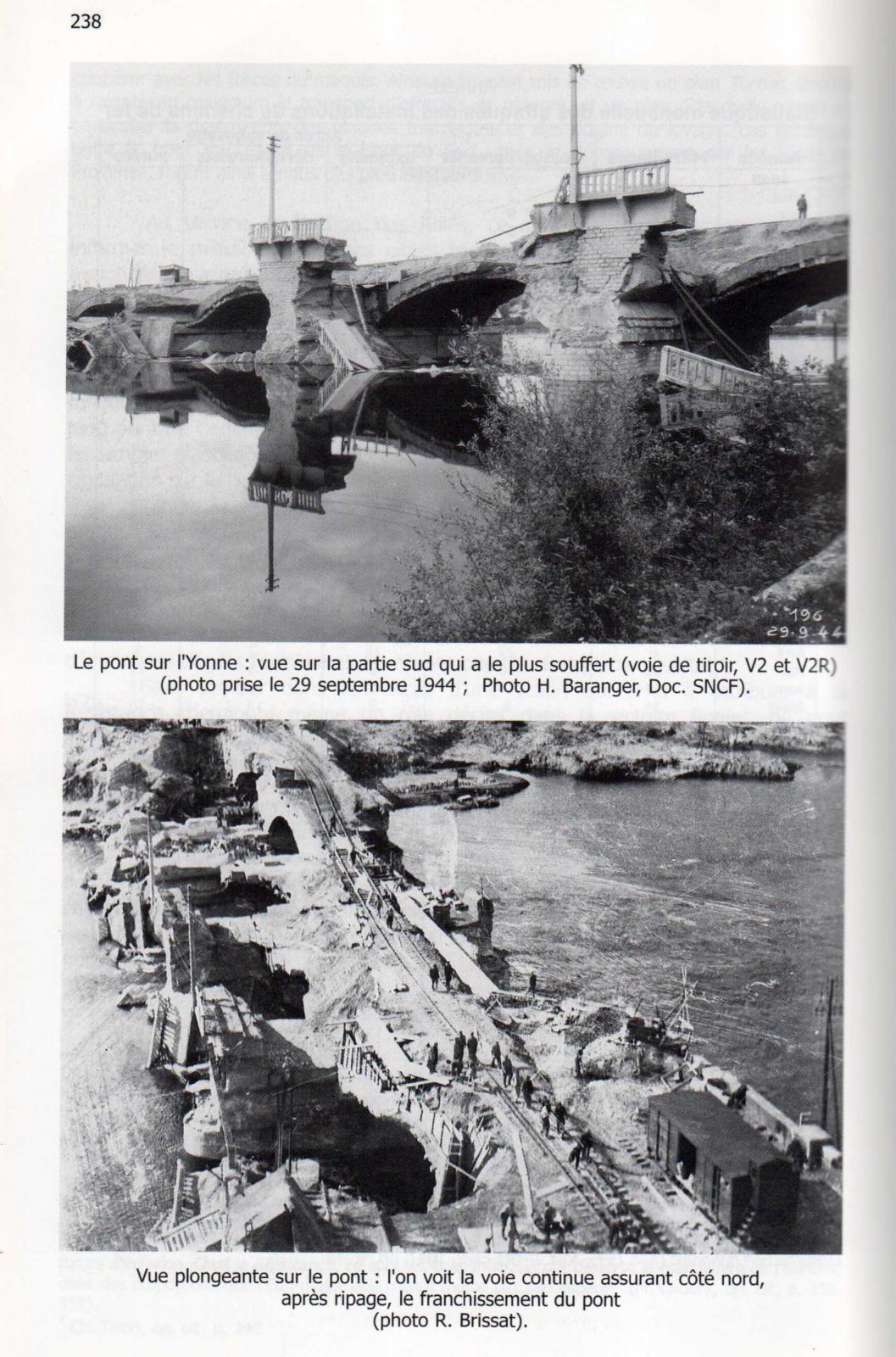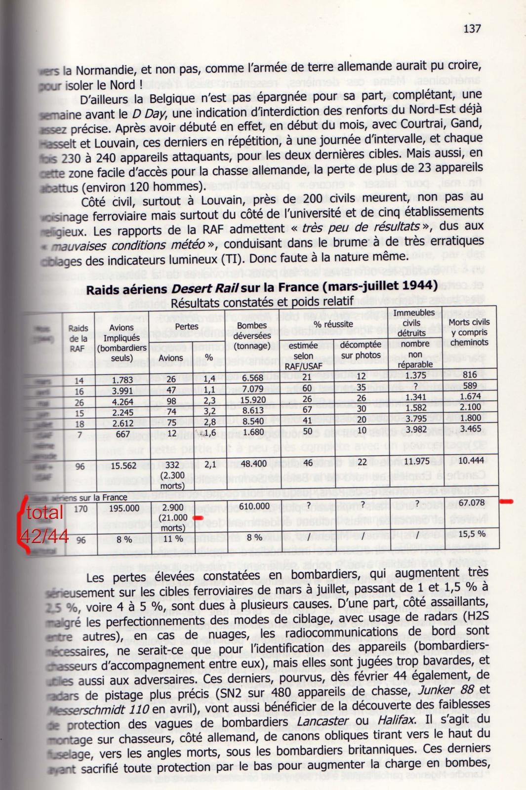 Concernant les bombardements et leurs effets collatéraux sur les populations civiles, il n’y a que Yves Machefert-Tassin (bien connu parmi les ferrovipathes), qui ait fait une étude complète sur le sujet. Il a écrit un livre intitulé : « Les bombardements des Alliés sur les rails français (1942-1945) un bilan discutable » (beaucoup de photos dans ce livre) Georges Ribeill a écrit une partie intitulée : « Une saison en enfer, Migennes sous les bombes (été 1944), chroniques, témoignages et documents ». Pour avoir ce livre, le commander directement à Georges Ribeill, 89 500 Dixmont ou ribeillgeorges@aol.com C’est un livre n’a pas eu un grand succès, car c’est technique, c’est du « Machefert-Tassin » ou plutôt « YMT » ; donc, pas très « vendeur » pour le grand public. C’est très bien que pour la première fois, un président de la République française commémore la mémoire des victimes civiles qui ne comptaient pas beaucoup pour l’histoire. Ci-joint, les statistiques des bombardements établi par YMT, on remarque en bas le total guerre des pertes civiles : 67.078, et aussi le nombre important d’équipages de bombardiers tués : 21 000 morts ; un B17 abattu et cela pouvait être 10 hommes d’équipage tués. Exemple du bombardement massif de Migennes pour détruire le pont SNCF de la ligne Impériale passant sur l’Yonne. L’US Air force a déversé des tonnes de bombes dessus, quelques unes ont creusé des trous dans ce pont en maçonnerie, mais les Allemands ont réussi à faire passer leurs trains en faisant riper une voie entre les trous de bombes !!!