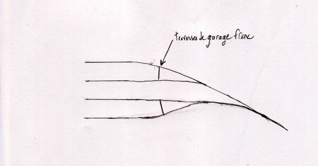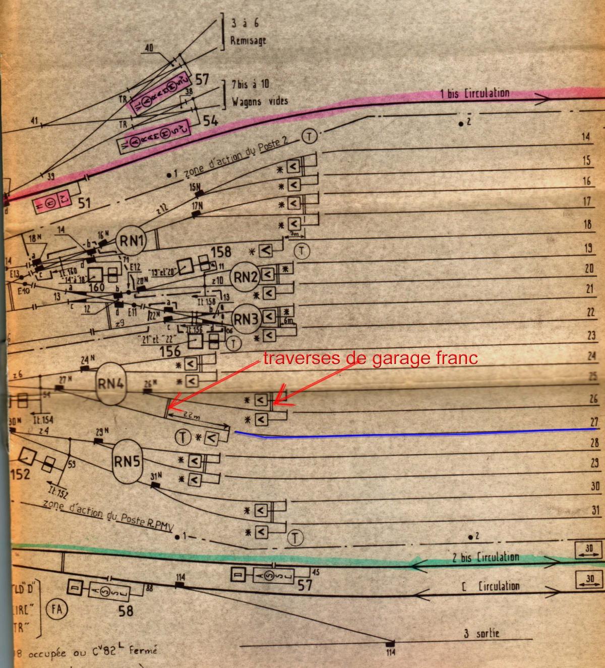 Sur ce schéma de signalisation du faisceau réception (côté Paris) de Villeneuve-Saint-Georges, on voit que le train reçu à la Voie 27 devra s’arrêter comme prévu au chevron pointe en haut, à moins qu’un agent de manœuvre lui demande de tirer jusqu’à la traverse de garage franc qui se trouve à cet endroit à 22 m en aval du chevron, (traverse représentée par un double trait sur le schéma). Et s'il n'y avait pas de chevron pointe en haut, le conducteur pourrait tirer de lui-même jusqu'à la traverse de garage franc sans "engager" le croisement de la voie à sa droite.