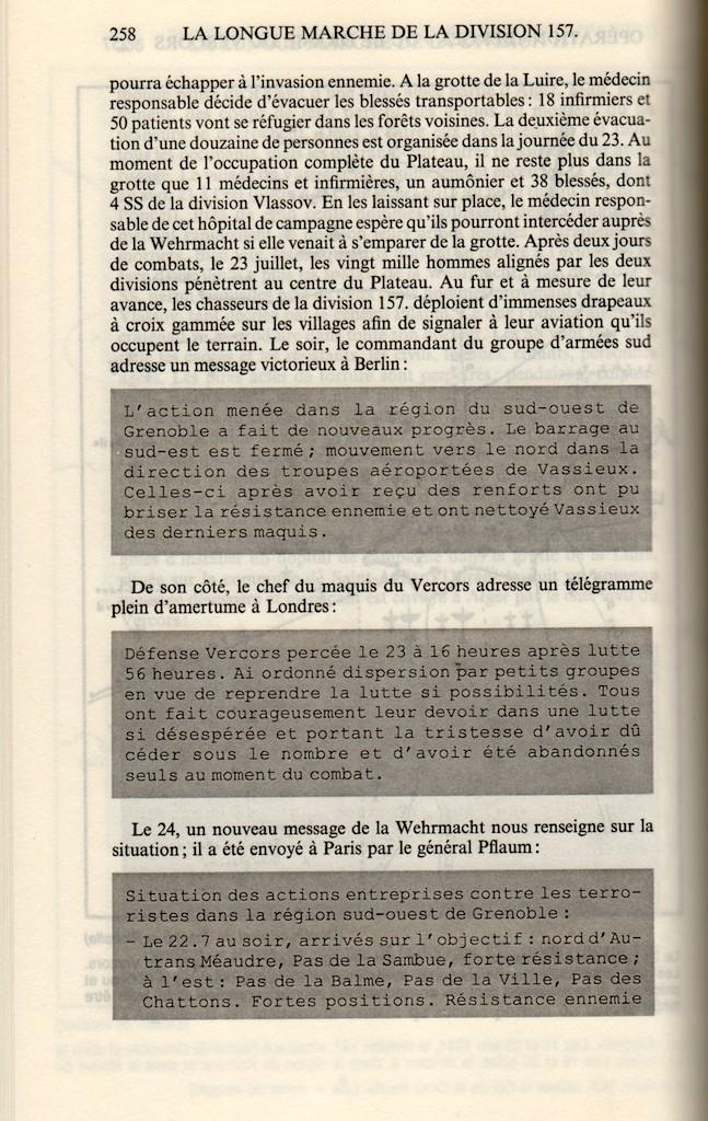 L’article du Conseil général de l'Isère, sur la fin du maquis du Vercors rappelle la légende noire de « la trahison des alliés » qui auraient laissé tomber le maquis lorsqu’il a été attaqué par la 157e division de la Wehrmacht en juillet 1944. Un colonel suisse a écrit un livre extrêmement intéressant sur les opérations de la 157e réserve-division allemande qui a combattu aux Glières et dans le Vercors sud. C’est un livre très technique, à la suisse, c’est-à-dire très sérieux. Le maquis du Vercors sud avait eu comme instructions de Londres de se faire discret, de ne pas énerver les Allemands, et de s’entrainer sur le plateau du Vercors afin qu’au moment voulu, ils se mettent en unités constituées à disposition des armées alliées qui remontaient la vallée du Rhône. Malheureusement, des partisans (d’où, le titre du livre « maquis et partisans) ont commis des actions contre-productives (attentats, règlements de compte) dans la vallée, ce qui a donné un motif aux Allemands pour intervenir. Voilà pourquoi le maquis aurait été abandonné à son sort ; il n’aurait pas obéi aux ordres de Londres (voir le deuxième encadé de la page 258 du livre) C’est ce que j’ai compris de cette affaire. L’article parle aussi de la citadelle imprenable du Vercors Il y a quelques années, j’ai passé mes vacances à Gresse-en-Vercors, et j’ai parcouru un « Goulet » de la formidable muraille du Vercors sud. Les Goulets qu’on appelle « couloirs » dans les Alpes du Nord se situent entre les éperons, ils sont raides mais ont été remontés par les soldats allemands qui ont surpris les maquisards sur le plateau qui ne s’attendaient pas à ce qu’ils passent par là ; sauf au Grand Goulet qui est facile, et même là, les sentinelles ont été surprises.