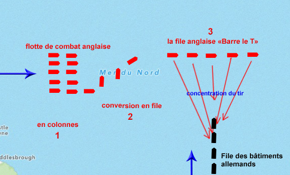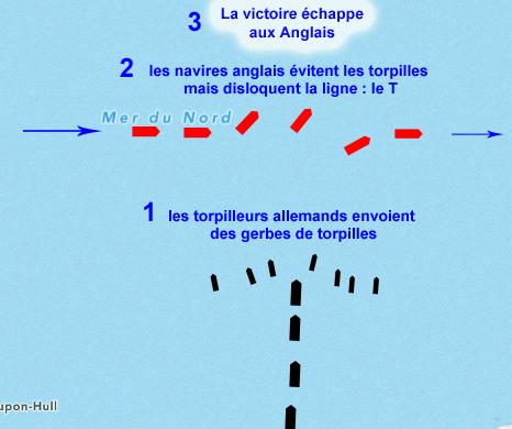 La grande bataille navale du Jutland — 1916 mer du Nord. En 1916, la marine impériale allemande avait envie d’en découdre avec le gros de la marine anglaise, car, jusqu’alors, il n’y avait pas eu de véritable confrontation entre les 2 flottes. Mais, il en était de même pour les marins anglais et les 2 marines se surveillaient avec attention. Enfin, le 31 mai 1916, la marine allemande sort de ses bases en mer du Nord ; la marine anglaise à l’affut fait de même. C’est donc une sortie en force des 2 marines : Angleterre : 140 bâtiments, dont 28 cuirassés Dreadnoughts pour un effectif de 60 000 marins. Allemagne : 99 bâtiments, dont 16 cuirassés, effectifs de 45 000 marins. Le rêve de tout amiral, un peu comme pour l’échec et mat, est de « Barrer le T » de la flotte adverse, c’est-à-dire de se présenter, en ligne de file, perpendiculairement à l’avant de la ligne ennemie, de façon à pouvoir l’écraser de tout le feu de sa « bordée » alors que l’ennemi se trouve, lui-même, dans une situation défavorable. Cette disposition est difficile a réaliser de manière idéale avec une formation de 24 bâtiments, formés en 6 colonnes, sur un front de 5 nautiques (10 km) et d’en faire une « ligne » de quelque 10 km de longueur, comme c’était le cas pour les Anglais. Par exemple, durant la conversion, un croiseur anglais a eu sa barre qui s’est coincée et a tourné en rond plusieurs fois avant de prendre sa place dans la ligne, avec plusieurs risques de collision. Néanmoins, les Anglais vont réussir à « Barrer le T » à la Marine allemande. C’est qu’alors, comme avec le général Joffre le 6 septembre à la bataille de la Marne, l’amiral allemand Scheer donne l’ordre à ses torpilleurs de charger à mort la ligne anglaise et de lâcher toutes leurs torpilles. Son ordre est resté dans les annales « croiseurs de bataille, sus à l’ennemi, s’engager à fond », (les croiseurs sont encadrés par les torpilleurs). L’amiral Beatty prend peur, sa ligne se disloque (ses bâtiments se mettent de front pour éviter les torpilles) et l’efficacité de la concentration de son tir perd toute sa puissance. L’occasion de détruire le gros allemand ne se représentera plus. La bataille va continuer par des accrochages secondaires, mais meurtriers pour les Anglais et puis tout le monde va regagner ses bases avec de nombreux navires avariés. Bilan stratégique de cette bataille = il y a match nul pour les deux marines. Mais, il y a controverse et encore actuellement, les historiens se chamaillent sur le vrai vainqueur de cette bataille. Bilan matériel et humain : Angleterre : 13 navires coulés (dont 6 croiseurs de bataille) et 6097 marins tués ! Allemagne : 11 navires coulés (1 cuirassé, 1 croiseur), 2551 marins tués. Cette différence est expliquée par la supériorité allemande dans résistance aux coups reçus par leurs bâtiments (l’amiral anglais Beatty s’est plaint de ce que ses croiseurs « sautaient comme des barils de poudre), par la supériorité de leur optique (jumelles, télémètres, projecteurs) par la supériorité de leur poudres et explosifs (je pense à la Gross Bertha). Voilà comment se fait une réputation made in germany !!