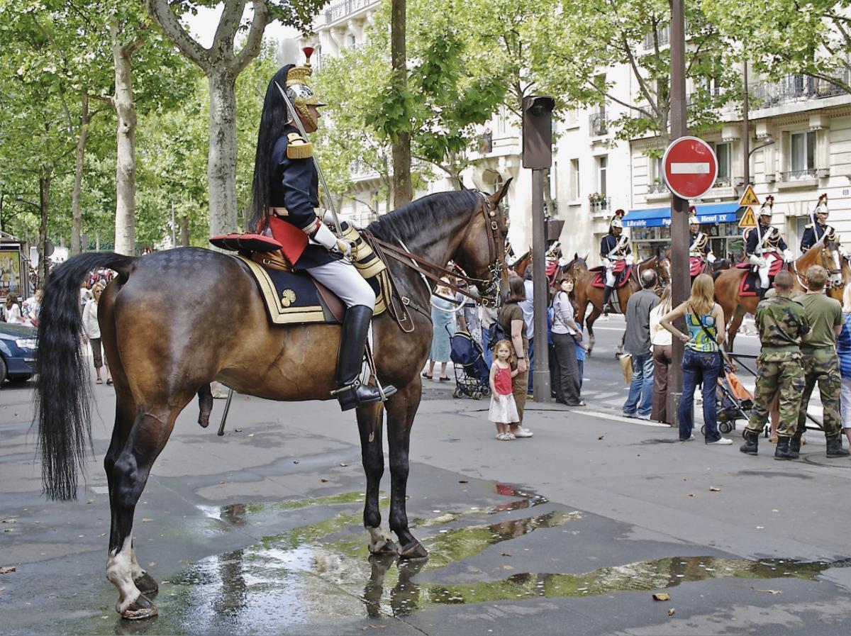 Le régiment de cavalerie de La Garde républicaine est la dernière unité montée de l’Armée française. Ce régiment composé de 4 escadrons a un effectif de 500 chevaux. La Garde rentre en fanfare dans sa caserne boulevard Henri IV après le défilé du 14 juillet. Le cheval du cavalier vient de faire un petit besoin sur le trottoir.