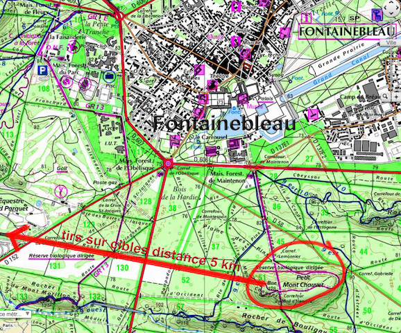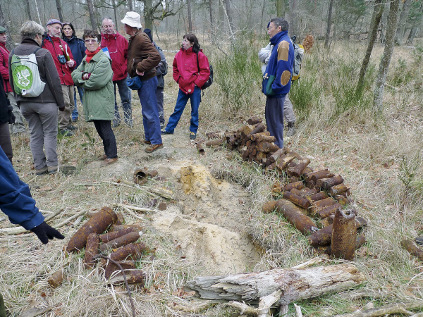 Lors de la 1re bataille de la Marne (il y a en eu une 2e en 1918), l’armée française a utilisé avec succès le canon de 75. Il a fait sa réputation grâce à sa grande cadence de tir, son utilisation opérationnelle sur le terrain. Le manuel d’emploi du canon de 75 a été mis au point à l’école d’artillerie de Fontainebleau qui a été en activité de 1871 à 1940. Il y avait donc un champ de tir dans cette forêt royale, les pièces étaient installées au Mont Chauvet (110 m), juste en bordure de la ville, les cibles se trouvant à 5 km de là. Il y avait même des canons de forteresse de 240 mm dont il reste les fondations sur le mont Chauvet. Bien sûr, la charge des obus était calibrée pour limiter la portée, c’était l’utilisation opérationnelle du canon, le commandement de la pièce, de la batterie, qui était mis en avant dans cette école. La forêt est couverte de blocs de grès, gros, petits et des affleurements gréseux au niveau du sol. Voilà pourquoi, en plus des éclats, on retrouve encore pas mal d’obus non explosés, obus qui ont ricoché sur le grès. Sur la photo, le spécialiste de l’Association des Amis de la forêt de Fontainebleau (assoc centenaire) nous montre un dépôt d’obus rassemblés par des membres de l’association. En 1940, les Allemands ont fait main basse sur des milliers de canons de 75, qu’ils ont modernisés pour les réutiliser sur le front russe.