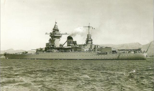 Même actuellement, un navire avec une artillerie classique (je ne sais pas s’il en reste beaucoup) doit se mettre perpendiculaire à l’ennemi de manière à ce que toutes ses pièces tirent en « bordée ». La marine française d’avant-guerre avait construit les fameux croiseurs de bataille « Dunkerque » et « Strasbourg » dont tous les Français étaient fiers. Ces navires n’avaient pas de canons en tourelle à l’arrière, car ils avaient été conçus pour faire la chasse à l’ennemi ; prétention des amiraux français qui pensaient imposer leur tempo à l’ennemi ; un peu comme nos grandes manœuvres militaires du temps de l’époque soviétique où les « bleus » l’emportaient tout le temps sur les « rouges ». Nos croiseurs de bataille n’ont pas fait d’exploits, ils s’en sont pris plein la figure par les Anglais à Mers-le-Kébir en juillet 1940, mais c’est une autre histoire pleine de polémiques toujours actuelles. Histoires de Gaulois Le croiseur de bataille "Strasbourg" ; l'artillerie lourde est à l'avant.