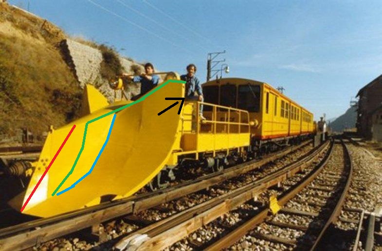 A mon avis, et cela n'engage que moi, cette étrave compressait trop la matière au lieu de la dégager! 1 ) la ligne d'attaque positionnée à environ 45 ° devrait se trouver à 10 ° de mois ( ligne rouge ). 2 ) la face d'accélération et d'éjection de la matière est trop en arrière ( ligne bleu ) la face ainsi créée est trop perpendiculaire au sens d'avance de l'outil ( étrave ). Cette face aurait du prendre naissance bien plus en avant pour former une parabole d'éjection accélérant la matière ( même à faible vitesse ). (Lignes vertes). 3) Enfin, la flèche noir indique que les oreilles guide d'éjection ( à des vitesses supérieurs à 30 kmh ) devraient êtres plus inclinées vers l'arrière et orienté légèrement sur l'extérieur afin de faire retomber la neige sur les côtés et non sur l'avant. Sinon, un porte à faut un peu long limite le déneigement au plus proche des supports du 3 ème rails. Encore une fois, cette réflexion n'engage que moi! ( hi! hi! hi! )