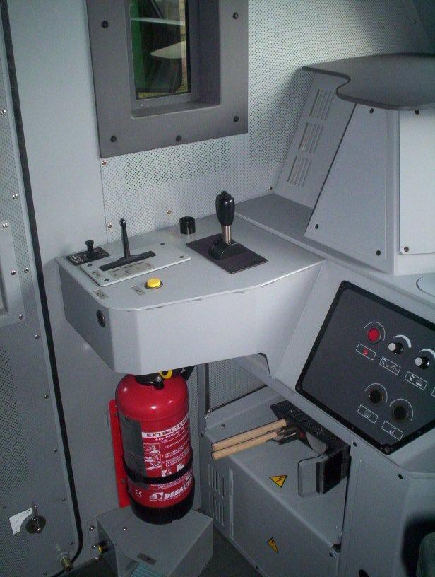 Gagné ! En effet, le poste de conduite est au centre de la cabine et il est impossible de surveiller le train en regardant par la fenêtre ET avoir la commande des orgames de sécurité à portée de main. Pas question de manoeuvrer comme les routiers, avec les rétros. Il y a donc pas mal de contraintes avec cette machine lors des manoeuvres, lors des pousses d'une autre loc en véhicule lors de la mise en tête ... bref, un véritable casse-tête. C'est pour cette raison que pour les séries à pupitre central à venir comme le diesel série 75000, il y a une commande déportée à coté de la vitre gauche qui permettra de faire ce type de manoeuvre agent seul. Exemple sur new diesel série 75000 (photos de la commande déportée)