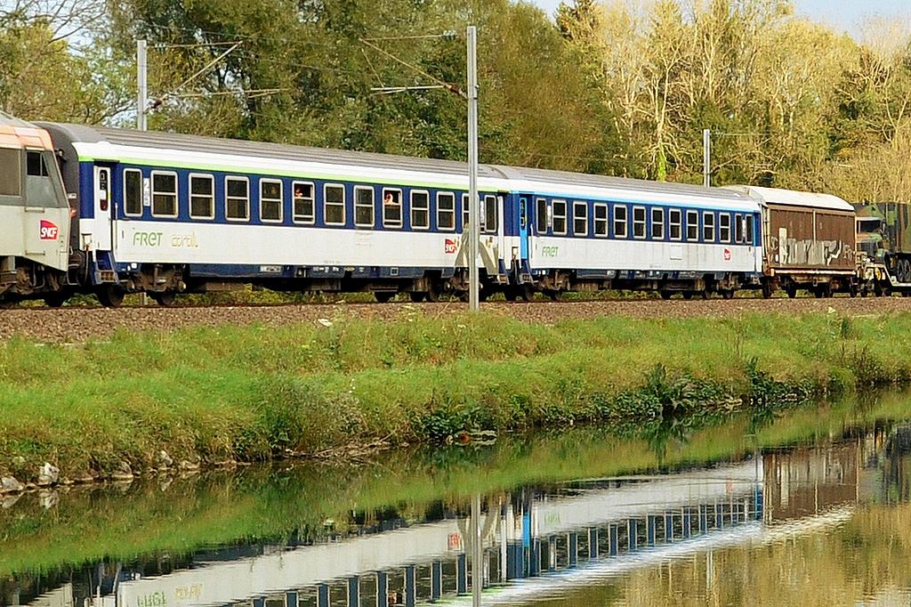 Bonsoir tout le monde. Train militaire Chèvremont - Les Arcs-sur-Argens photographié à Branne le 15 septembre dernier, avec la BB 26229 en tête: A noter la mention "Fret" sur les voitures Corail, première fois que je vois ça !