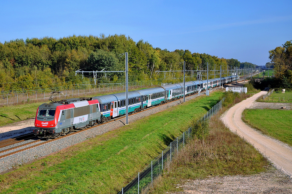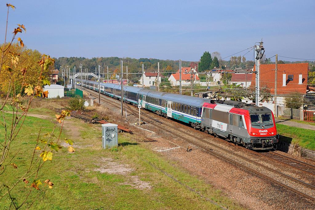 Salut tout le monde. Comme je l'avais signalé dans le >sujet idoine, le 220 avait pris un sacré retard le 26 octobre dernier. Parti pour une petite séance photo dominicale à Villers-les-Pots, j'ai eu la surprise de voir descendre la BB 37007 en tête d'une rame en direction de Vallorbe sur les coups de 11h30: J'ai d'abord pensé au 221 de la veille, ça lui aurait fait dans les 12 heures de retard, ce qui me paraissait beaucoup. Je consulte alors Gares en Mouvement et je vois le 220 affiché avec un retard indéterminé à l'arrivée à PLY. J'en déduis donc que cette rame doit monter en Suisse pour rapatrier les naufragés du rail sur Paris, et je décide donc de migrer vers Soirans pour attendre son retour. Bonne pioche !