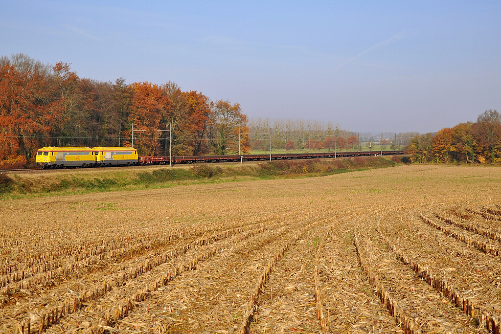 Bonsoir tout le monde. Un train de rails parti de Saulon en direction de Belfort pour un chantier de RVB, avec deux 67400 jaunes en tête (la 433 et la 562) vu au passage à Villers-Rotin lundi dernier: