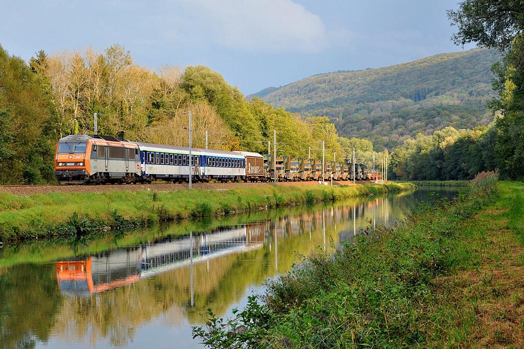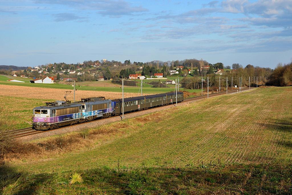 Bonjour tout le monde. Bonne idée cette nouvelle rubrique. Je vous propose donc une Sybic de chaque livrée. Tout d'abord la livrée béton, avec la BB 26210 en tête d'un train de bois photographié entre Culoz et Ambérieu: Torcieu, 9 avril 2011 On poursuit avec la livrée En Voyage, j'ai choisi la BB 26163 en tête de l'EC 90 Bâle-Bruxelles à quelques semaines de sa disparition: Hochfelden, 12 mars 2016 La BB 26227, unique Sybic trois phares en livrée Multiservices, photographiée au sud de Beaune: Meursault, 7 avril 2011 Je n'ai malheureusement que très peu de Sybic Fret en photo, mais j'avais quand même réussi à en avoir une sur la ligne de la Bresse, ici la 26192 longeant les ateliers de Saulon: Saulon, 24 mai 2011 Idem pour la BB 26070, que j'ai quand même pu immortaliser deux-trois fois avant qu'elle ne perde sa livrée TER Alsace si caractéristique. Voici donc une photo d'archive à plus d'un titre, puisque le Téoz diurne Paris-Austerlitz - Cerbère en tête duquel officiait la machine n'existe plus: Port-la-Nouvelle, 8 avril 2012 Et pour conclure, les deux dernières variantes de Sybic qui tendent à se répandre de plus en plus. Tout d'abord la livrée Carmillon, avec la BB 26046 qui fut la toute première machine à arborer cette livrée, et que l'on a pu apercevoir en tête de quelques Corail Strasbourg-Lyon dans leurs derniers mois d'existence: Poligny, 30 octobre 2011 ...et la livrée fantôme, avec la BB 26049 en tête d'un train de pèlerins Belfort-Lourdes: Santoche, 26 mai 2013
