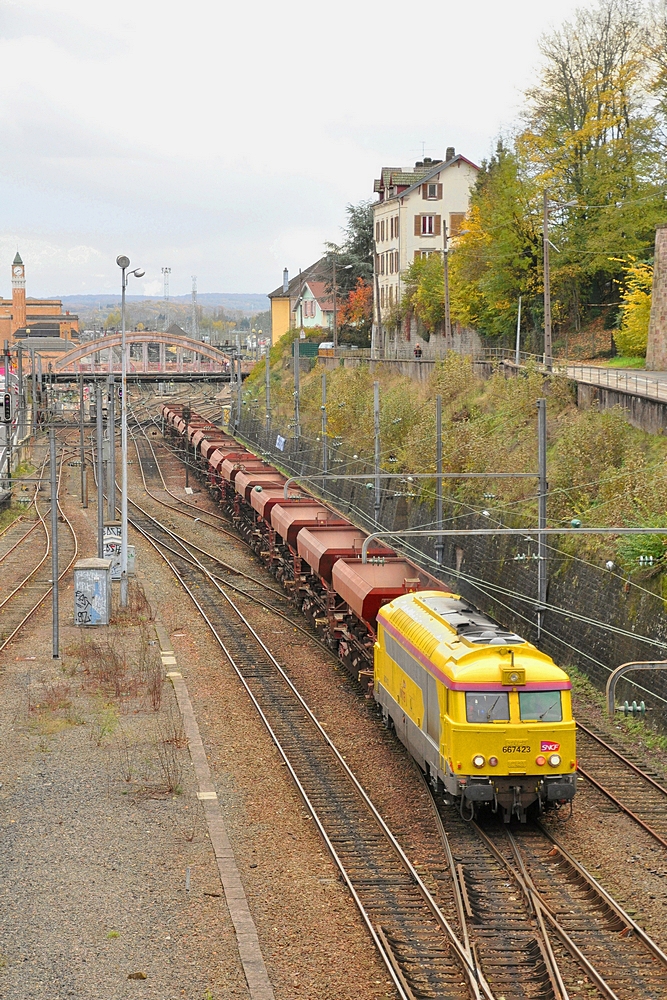 Bonsoir tout le monde. La BB 67423 Infra en tête d'un train de ballast vide quittant Belfort le 6 novembre dernier, sans doute pour la carrière de Giromagny: