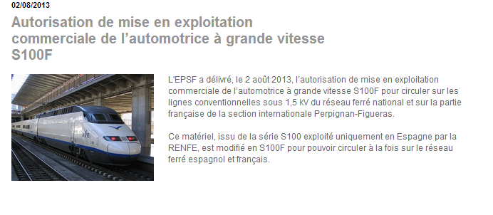 Effectivement, c'est là sur le site de l'EPSF : http://www.securite-ferroviaire.fr/fr/index.php?mod=1&id=193 L'autorisation reste limitée à Perpignan Figueras... Pas question de remonter vers Narbonne et Toulouse....