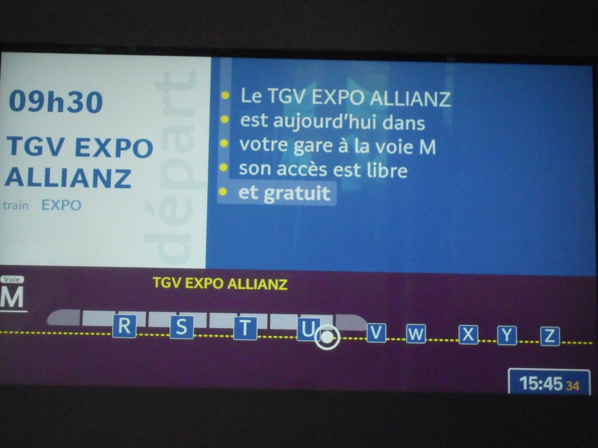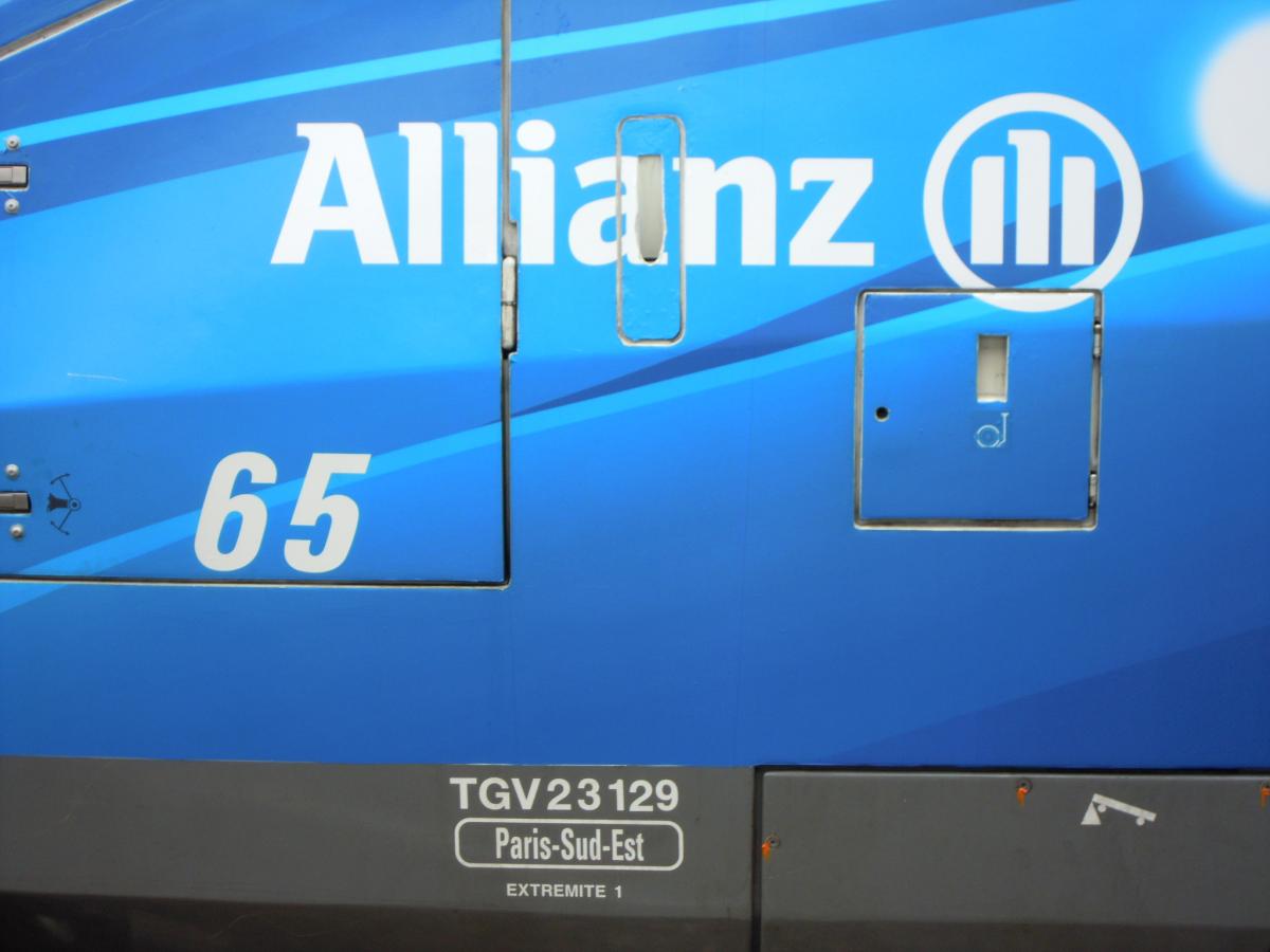 La rame TGV PSE 65 assure actuellement une tournée pour la compagnie d'assurance Allianz. Calendrier de l'exposition : Mardi 01/10 : Paris, gare de Lyon Mercredi 02/10 : Lille Flandres Jeudi 03/10 : Metz Ville Vendredi 04/10 : Strasbourg Samedi 05/10 : Besançon Viotte Lundi 07/10 : Lyon Perrache Mardi 08/10 : Lyon Perrache Mercredi 09/10 : Paris Nord Jeudi 10/10 : Rennes Vendredi 11/10 : Tours Samedi 12/10 : Nantes Lundi 14/10 : Limoges Mardi 15/10 : Bordeaux Saint-Jean Mercredi 16/10 : Toulouse Matabiau Jeudi 17/10 : Marseille Saint-Charles Vendredi 18/10 : Marseille Saint-Charles Samedi 19/10 : Nice Ville Quelques photos faites à Paris Lyon le 1er Octobre.