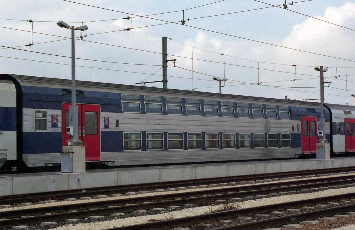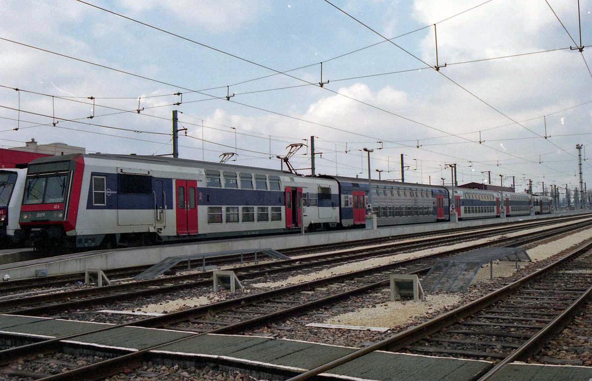 A y est!!! J'ai retrouvé les photos de la remorque Inox sur la 40A.... Photos faites au dépot de Villeneuve St Georges, Faisceau Banlieue du poste L en Avril 1993. La remorque La rame 40A (20579/580)