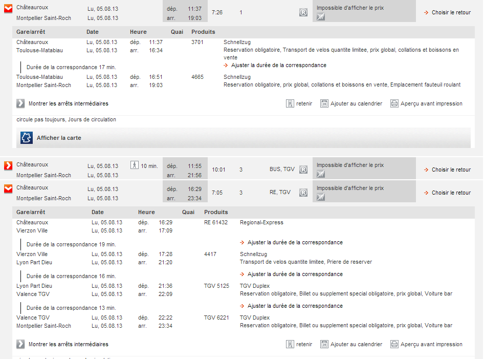 Le plus court prévu pour le 5 aout, c'est soit via Toulouse (pas de TGV, 1 changement), soit via Vierzon, Lyon et Valence TGV (3 changements)....