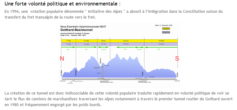 Je ne peux que t'inviter à te poster une petite heure au bord de n'importe quelle autoroute ou nationale française et regarder les plaques d'immatriculation des poids lourds.... Le nombre de camions qui transitent en France est considérable, tout simplement parce qu'avec la libéralisation du transport routier, les tarifs des sociétés espagnoles, portugaises ou des anciens pays de l'Europe de l'Est sont bien plus avantageux que ceux des membres historiques de l'Europe (France, ex RFA, etc...) Pour les trajets interrégionaux, Dieu sait que tu as raison!!! Problème, et pas des moindres: Il n'y a plus d'infrastructure ferroviaire pour les acheminer, hormis les grandes radiales. La politique de casse du réseau depuis les années 60 ne permettent quasiment plus d'assurer du trafic interrégional dans des temps comparables à ceux de la route... Là ou "on " a fermé, voire déferré des lignes, on a dans les années suivantes construits de belles autoroutes ou modernisé les nationales.... La traversée du Massif Central, entre autre, est un exemple flagrant. Les seules transversales ferroviaires sont Bordeaux Toulouse Marseille et Nantes Tours St Germain des Fossés Lyon. Tu dis "payé chèrement par les suisses".... Le financement de ces infrastructures et la réduction de la circulation des poids lourds avaient fait l'objet dune votation populaire en 1994. (voir ce lien : http://www.waldighoffen.com/waldimag/de-tout-et-de-rien/tunnel-saint-gothard-1/ ). La population n'a donc pas été mise devant le fait accomplit! Un extrait issu du lien ci-dessus (en capture d'écran):