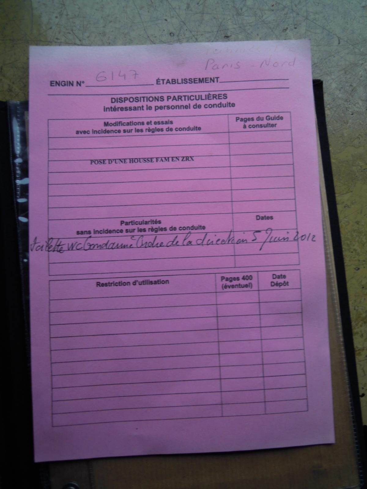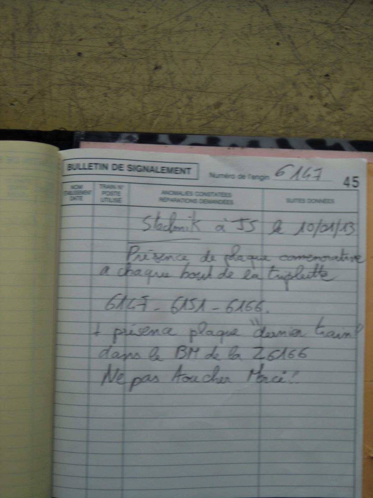 11. Bon ben voilà.... C'est fini..... J'ai fait un petit tour Paris <-> Persan ce matin avec Technicentre. Heureux d'avoir revu d'ancien potes de l'Antenne et de Persan, et connaitre aussi dans la "vraie vie" des personnes que je ne cotoyais que sur la toile.... Et d'avoir fait quelques gares "au manche", histoire de se rappeler quelques souvenirs de mes années à l'Antenne... Compo de la triplette historique: 6147/6151/6166. Ci joint quelques photos: Z 6166 en queue du 124319 à Paris Nord Z 6147 en tête du 124319 à Paris Nord Z 6147 à l'arrivée du 124317 à Persan beaumont Z 6166 prête au départ de Persan Beaumont au 124318 La plaque commémorative de l'évènement sur les 6147 et 6166 La fiche rose de la Z6147 a son dernier jour de circulation La dernière inscription sur le carnet de bord de la Z6147, le 10 janvier 2013 au matin