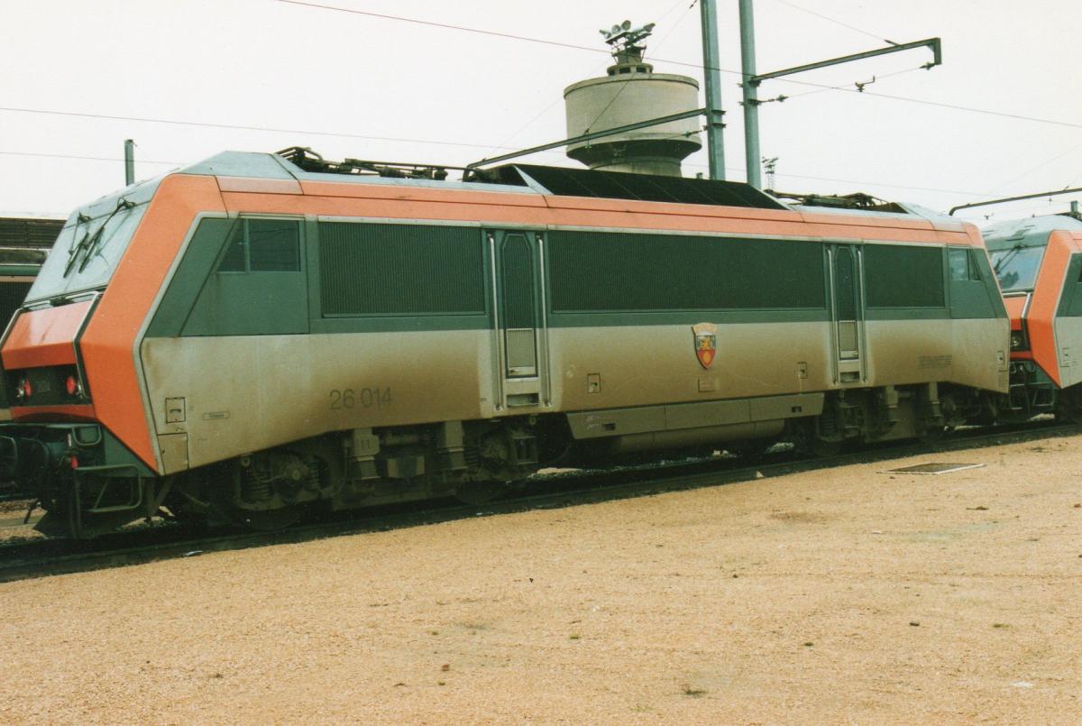 BB 26014 en livrée d'origine. Elle a été la première de la série à recevoir la livrée Multiservices en Mars 1996. Dépot de Villeneuve St Georges, Janvier 1994. BB 26014 en livrée multiservice et sigle "casquette", 2 mois après sa remise en peinture. Dépot de Villeneuve St Georges, Mai 1996.- [CC 6500 / 21000] - Sujet Officiel