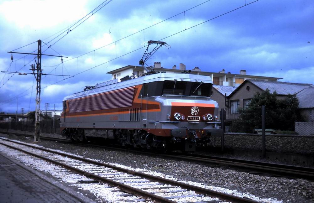 La 21001 alors qu'elle n'était pas encore livrée à la SNCF, sur les voies des usines Alsthom à Belfort en juin 1969. Photographe inconnu.