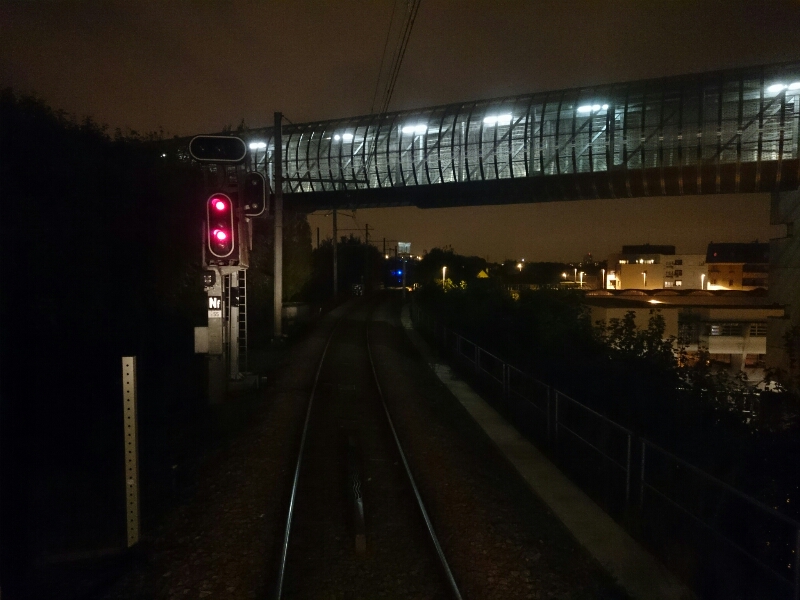 Pour la lampe bleue au fond je penche plus pour une Z2N qui redescendait voie 2 avec une voiture qui a la clim HS (grand classique, ca allume une lampe bleue sur le côté). J'ai pris la photo en attendant le passage d'un train, et il ne me semble pas qu'il y ait de signal à cet endroit sur la MG