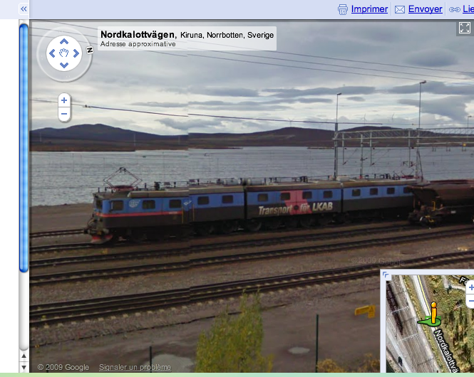 je regardais un peu à quoi ressemblait Kiruna, la ville la plus au nord de la Suède. en longeant la voie de chemin de fer, je suis tombé là dessus : http://maps.google.fr/maps?f=q&source=...,278.97,,1,4.44 une petite capture d'écran, des fois que.. ça doit en tirer des tonnes un truc comme ça