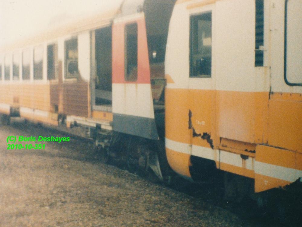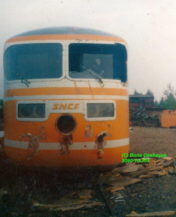 A l'été 1990, au fond à côté de la XR8346 illustrée récemment par ailleurs, l'extrémité 1 de la motrice diésel, déséquipée de sa face avant modernisée (on pourrait dire "étêtée" ). Au premier plan, tout ce qu'il reste de la motrice X4419 détruite par incendie criminel: