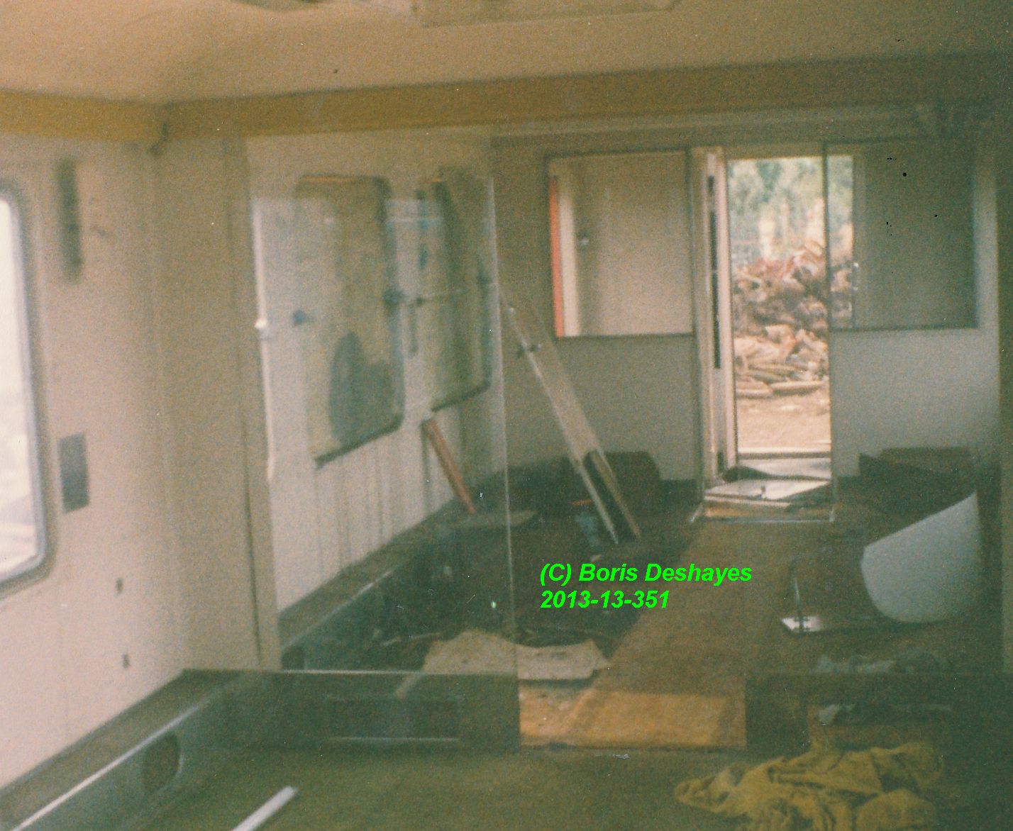 Sur la première photo, vue frontale de la caisse motrice turbine. Deuxième photo, il ne reste déjà plus que le châssis de la motrice diesel (photo publiée dans l'excellent livre des éditions du Cabri consacré aux turbotrains, paru début des années 2000, encore disponible chez elles me semble-t-il), puis détails de la motrice turbine quelques jours plus tard, toujours debout mais plus pour longtemps.