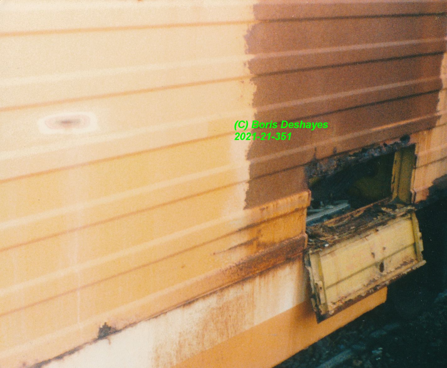 Hélas, notre engin est désormais rendu chez le ferrailleur, Gréverend. Bien que les deux caisses avaient été convoyées attelées par leur extrémité 2, comme elles étaient accouplées en service, le ferrailleur les a manoeuvré et les a placé têtes bêches en attendant l'heure fatidique: