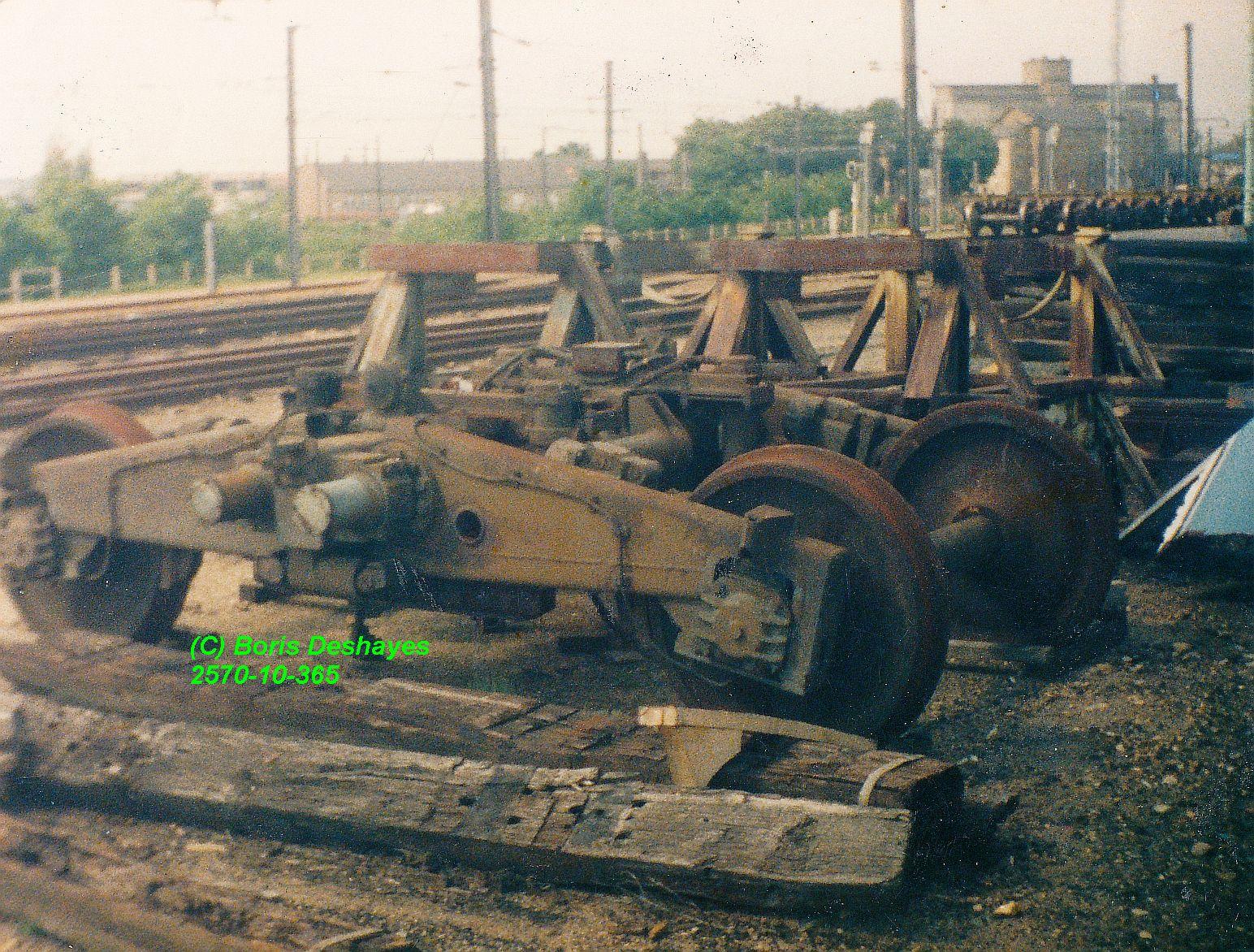 Dernière photo, un des bogies, que la S.N.C.F., consciente de leur intérêt, avait demandé au ferrailleur de récupérer, vu aux Ateliers du Mans. L'un d'eux a été remis à neuf et est exposé au musée de Mulhouse.