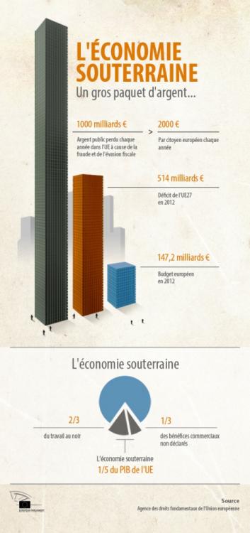 Selon le Parlement européen, le manque à gagner fiscal s'élèverait à 2.000 euros par citoyen européen. L'économie souterraine représenterait 20% du PIB de l'Union européenne.