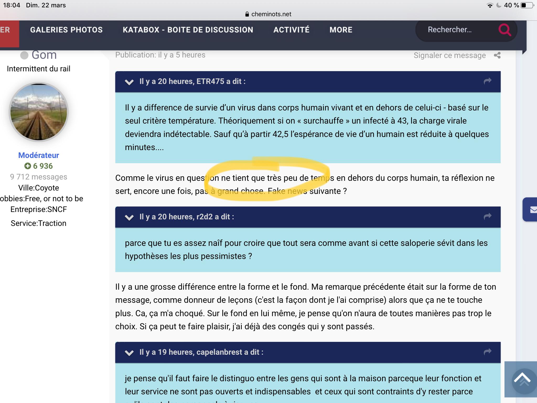 Non. A moins que tu ne sois médecin ou expert. En attendant la chose la plus intelligente que tu puisses faire serait de te taire plutôt que de raconter des conneries. Les experts eux même ne sont pas d'accord sur la durée de vie du virus en dehors du corps. On n'a que des médias avec des journalistes (qui ne sont que journalistes mais pas scientifiques) qui se ruent sur la première info venue pour faire du buzz sans attendre qu'elle soit corroborée par plusieurs analyses différentes et validée par la communauté scientifique. Merci de prendre le temps de réfléchir un peu plus qu'eux.