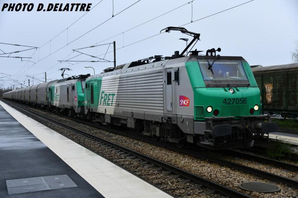 La BB 27056 au marquage original passe en gare d'Hazebrouck avec un Creil - Dunkerque en UM avec la BB 27032 le 02/03/2024
