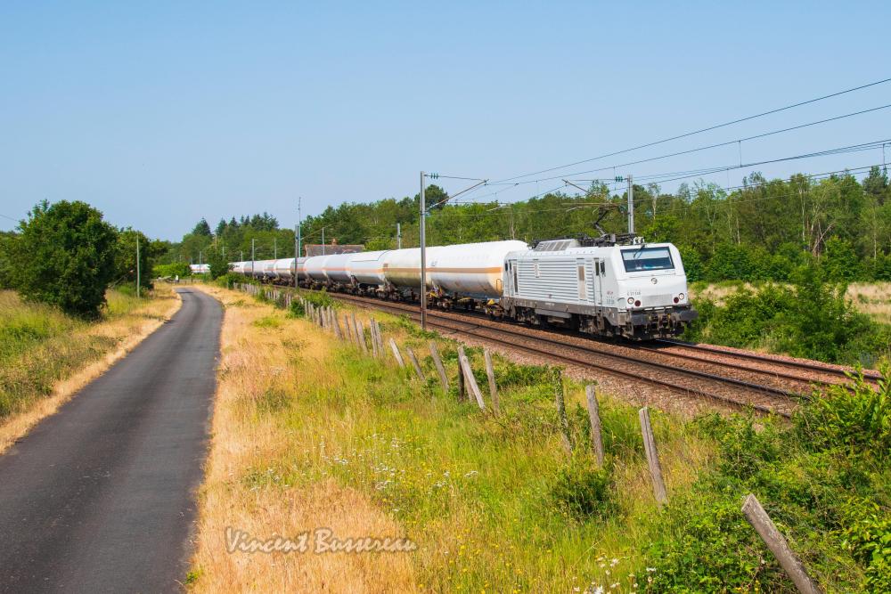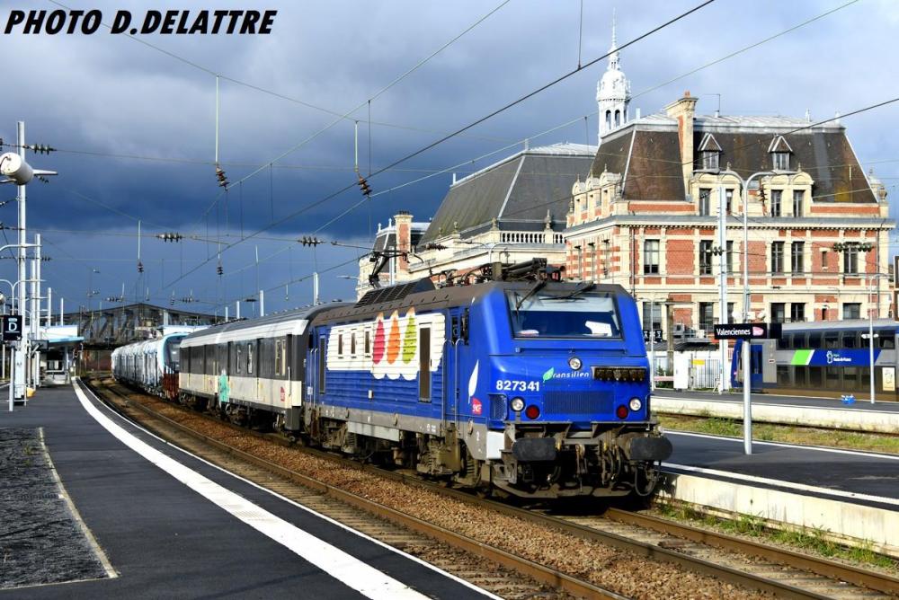 La BB 27341 avec la livrée Transilien (maintenant à l'AEF) quitte Valenciennes avec la rame RERNG 026K direction le CEF2 de Nançois Tronville