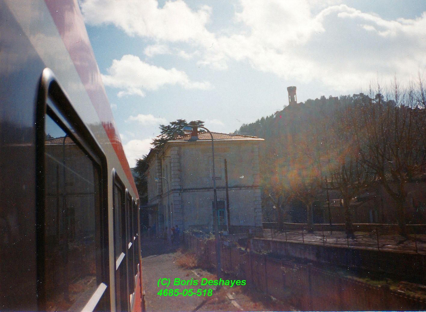 L'élément automoteur X4613-XR8638 est en tête d'un train qui va bientôt quitter Laon (02) pour Paris sous un beau rayon de soleil en août 1995.