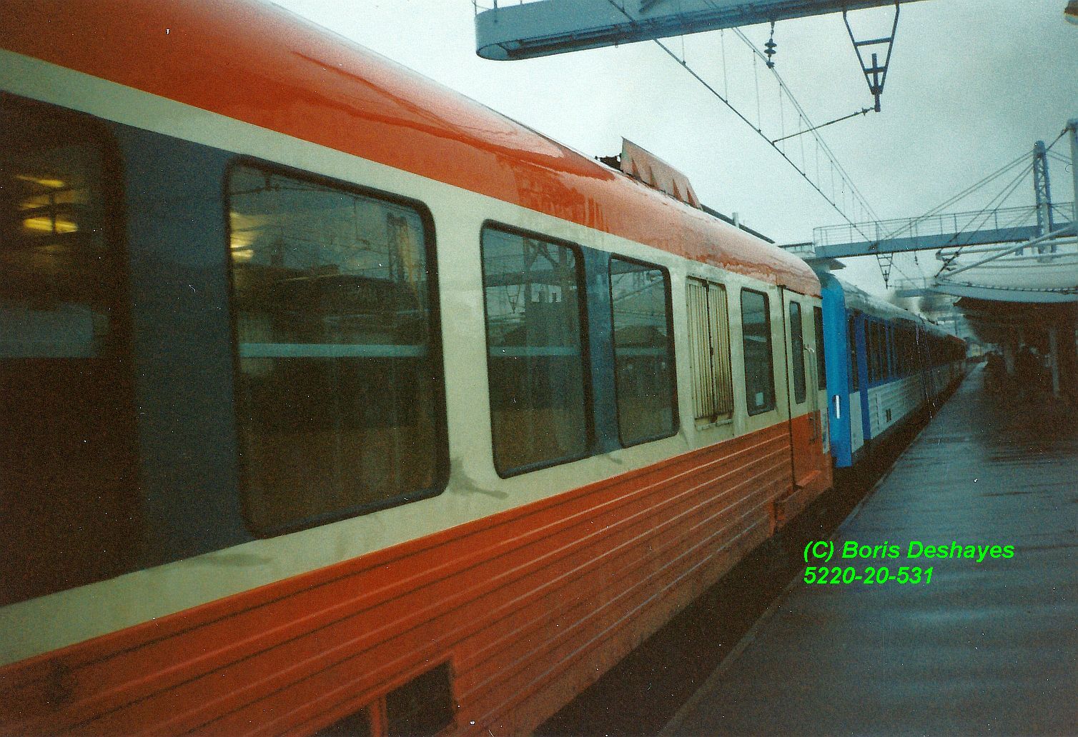 L'élément automoteur X4553-XR8565 est en coupure entre deux trains en gare de Compiègne (60), en avril 1995.