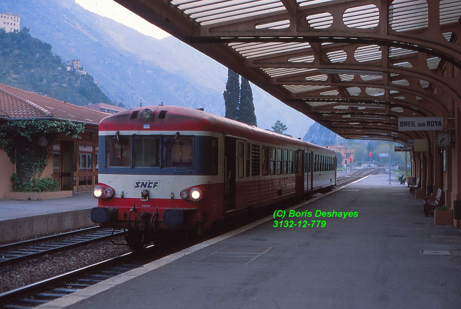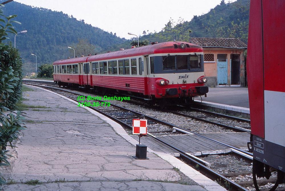 L'élément automoteur X4521-XR8614 dessert Peillon-Sainte-Thècle (06) en septembre 1996 tandis qu'il assure le train Breil-sur-Roya - Nice du midi.